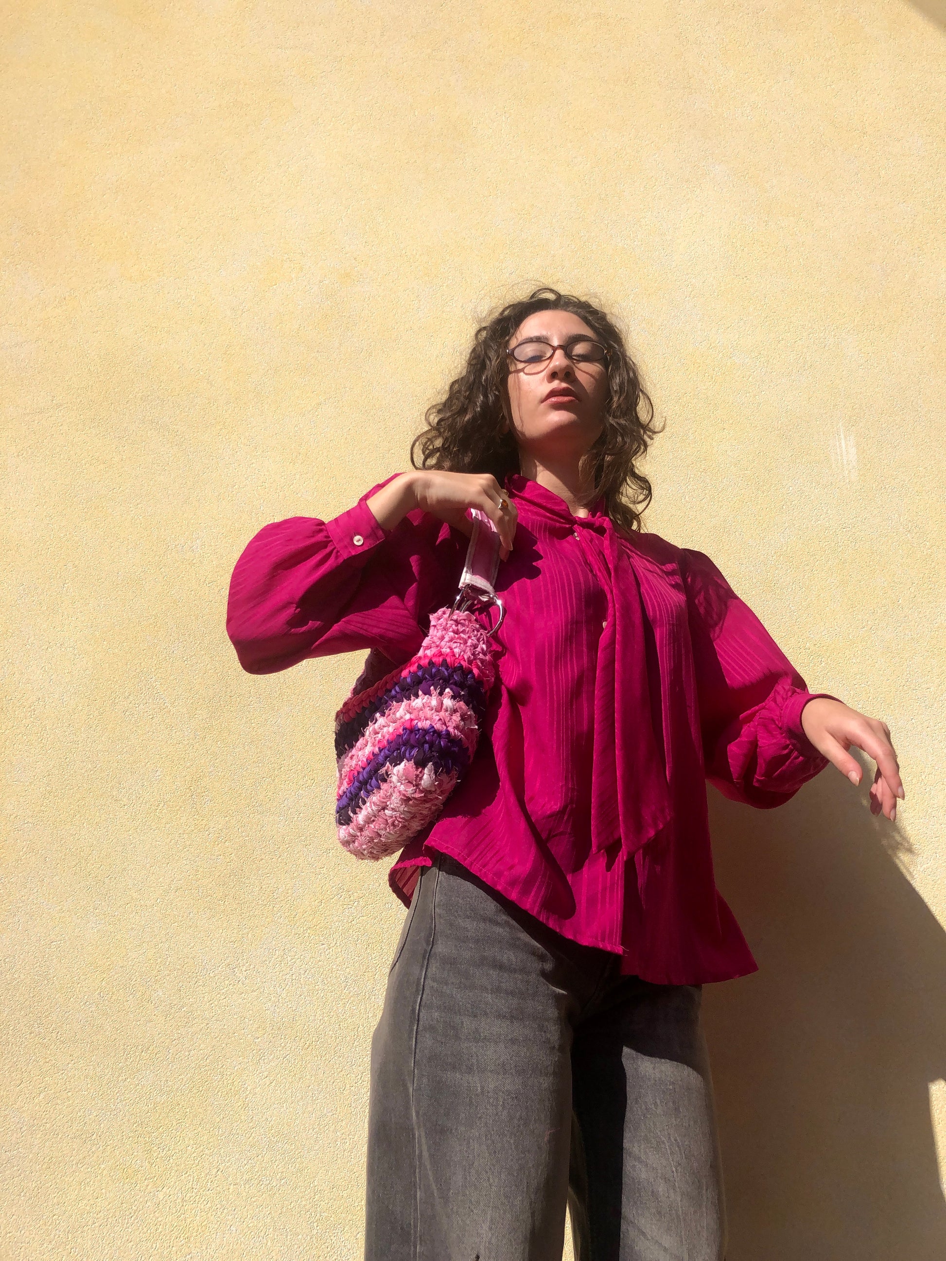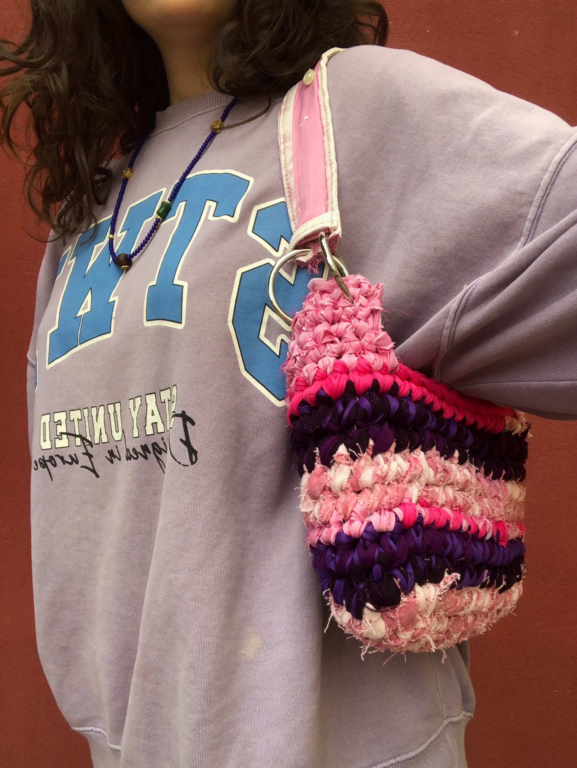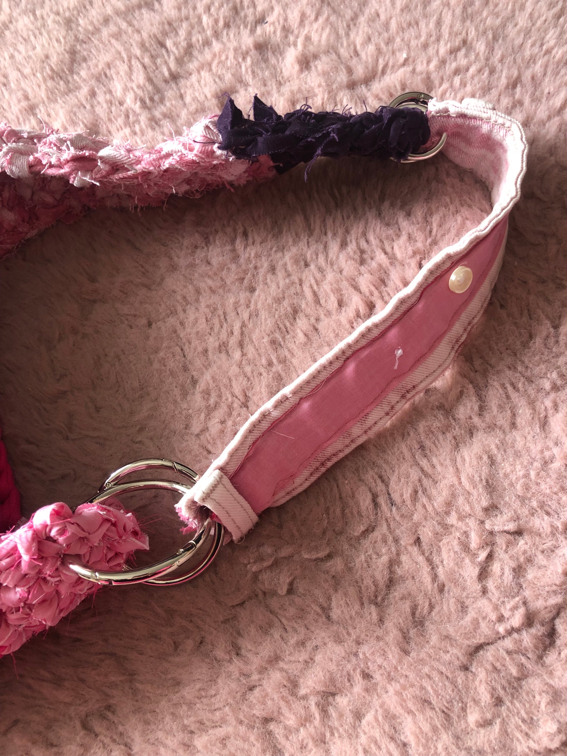 Pink Pop si caratterizza per un design vivace, con righe formate da pezzi di abbigliamento tagliati e intrecciati insieme. Il manico, composto da jeans rosa arricchito da un dettaglio cucito proveniente da una camicia, è fissato alle estremità tramite moschettoni argentati di dimensioni diverse, conferendo un aspetto originale e giocoso.