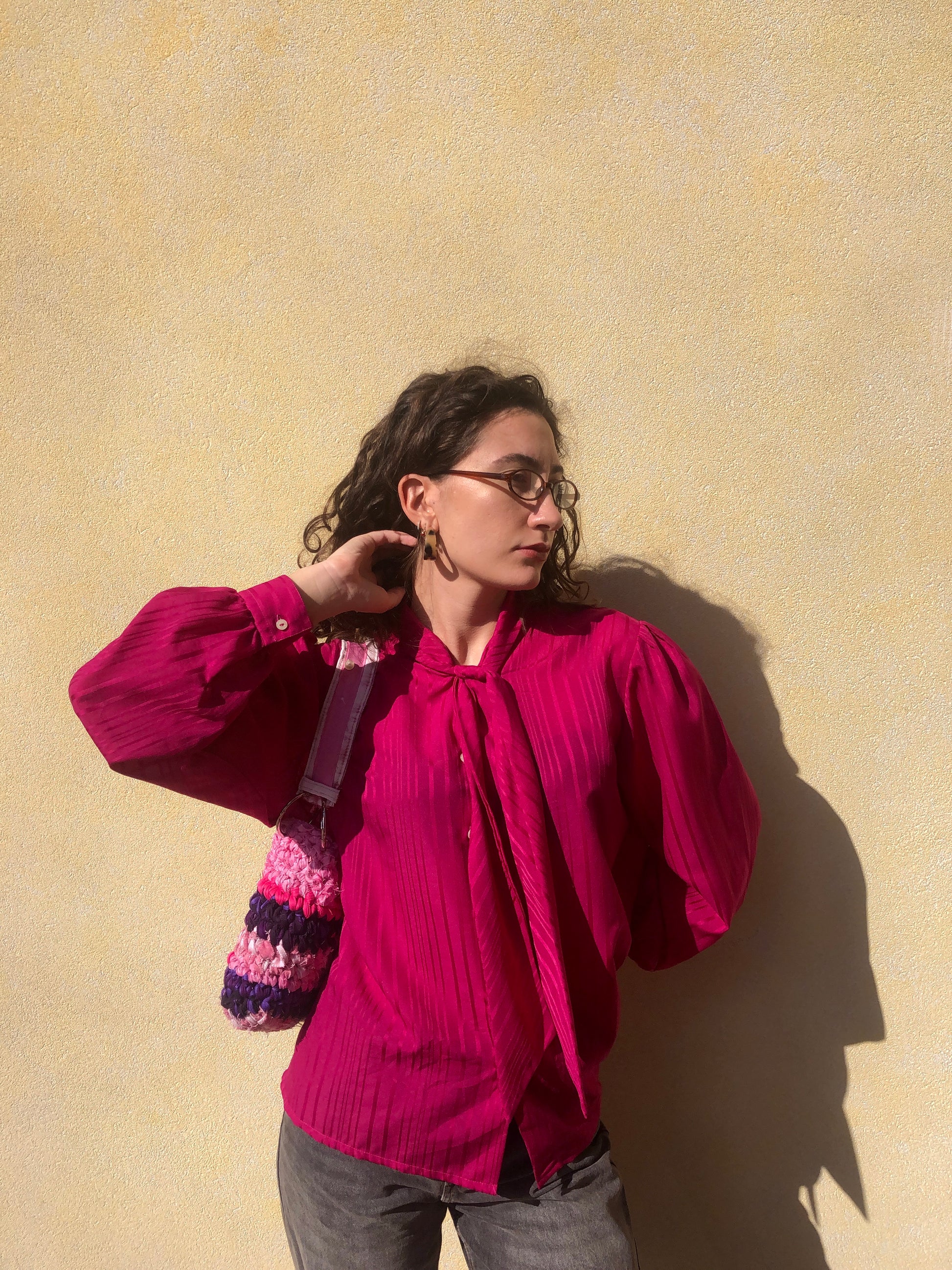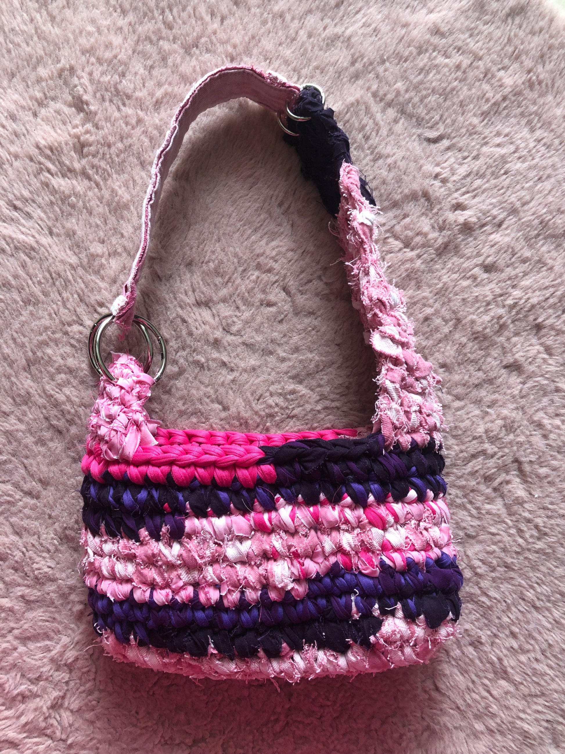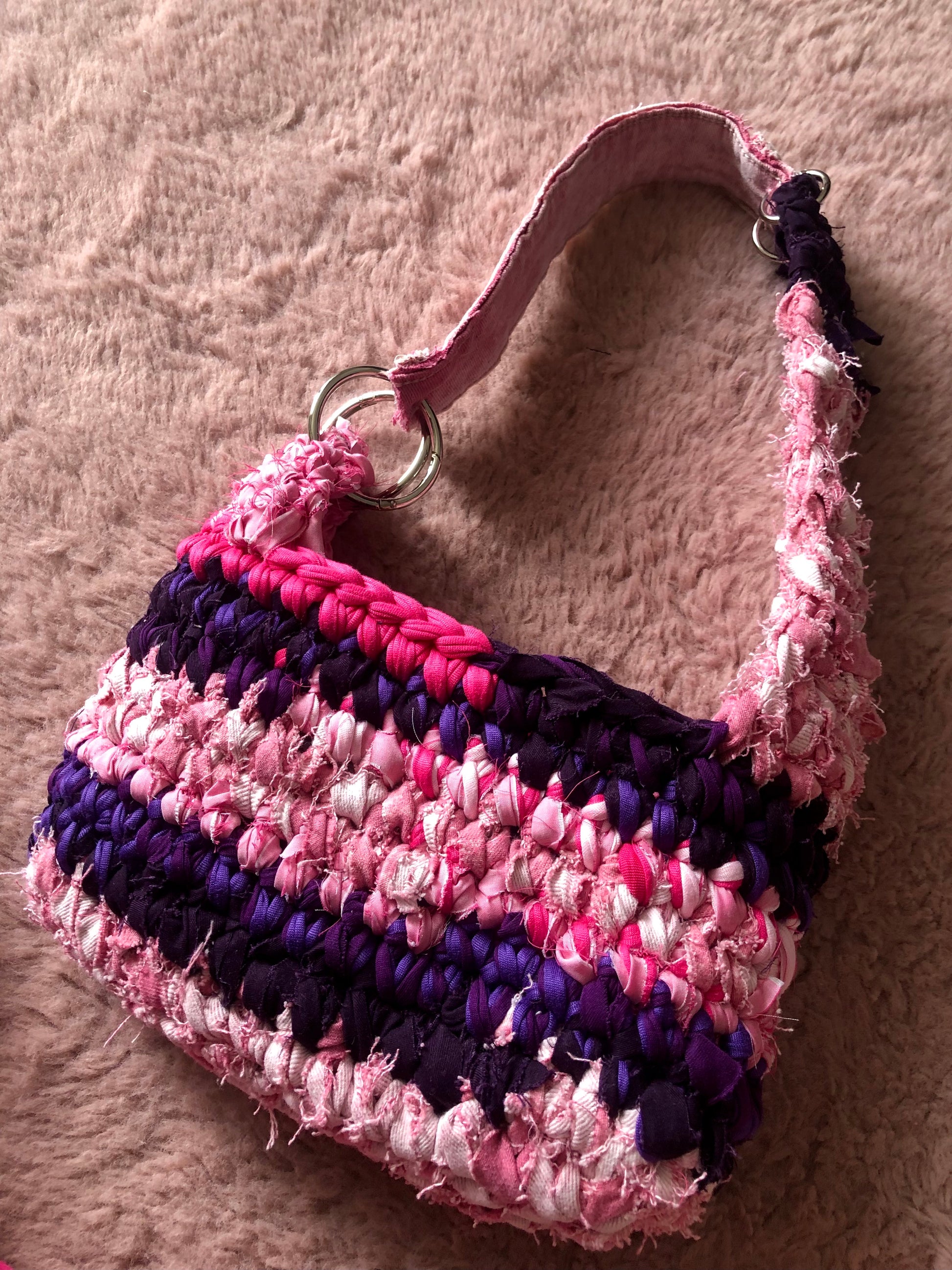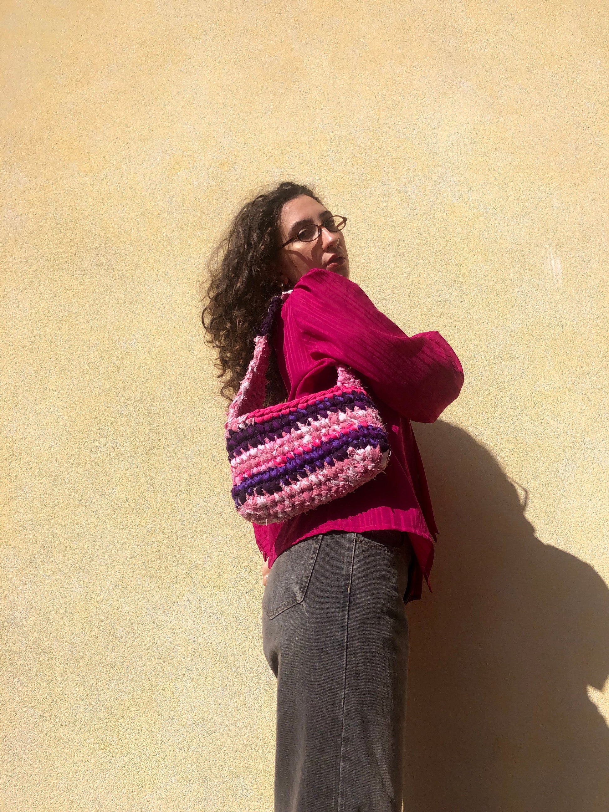 Pink Pop si caratterizza per un design vivace, con righe formate da pezzi di abbigliamento tagliati e intrecciati insieme. Il manico, composto da jeans rosa arricchito da un dettaglio cucito proveniente da una camicia, è fissato alle estremità tramite moschettoni argentati di dimensioni diverse, conferendo un aspetto originale e giocoso.