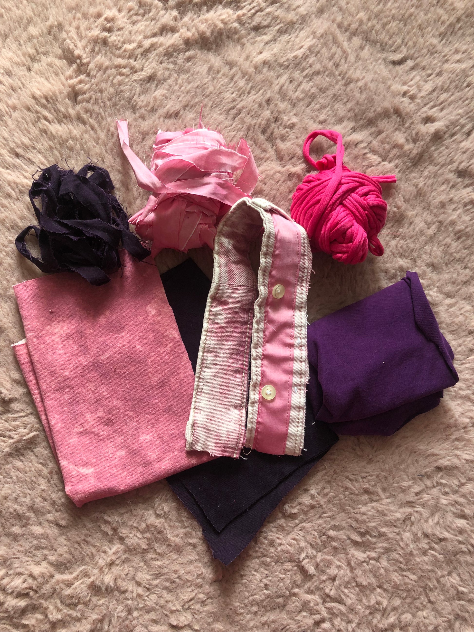 - Realizzata a mano con materiali riciclati: un jeans, una camicia, una t-shirt