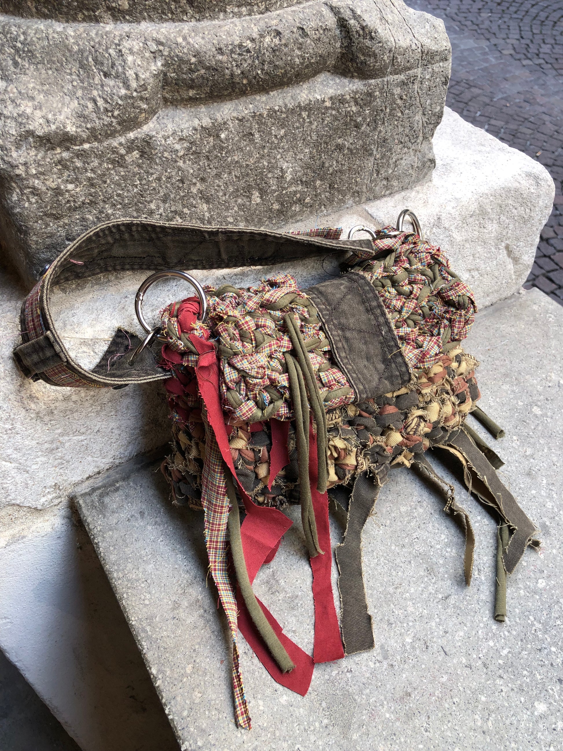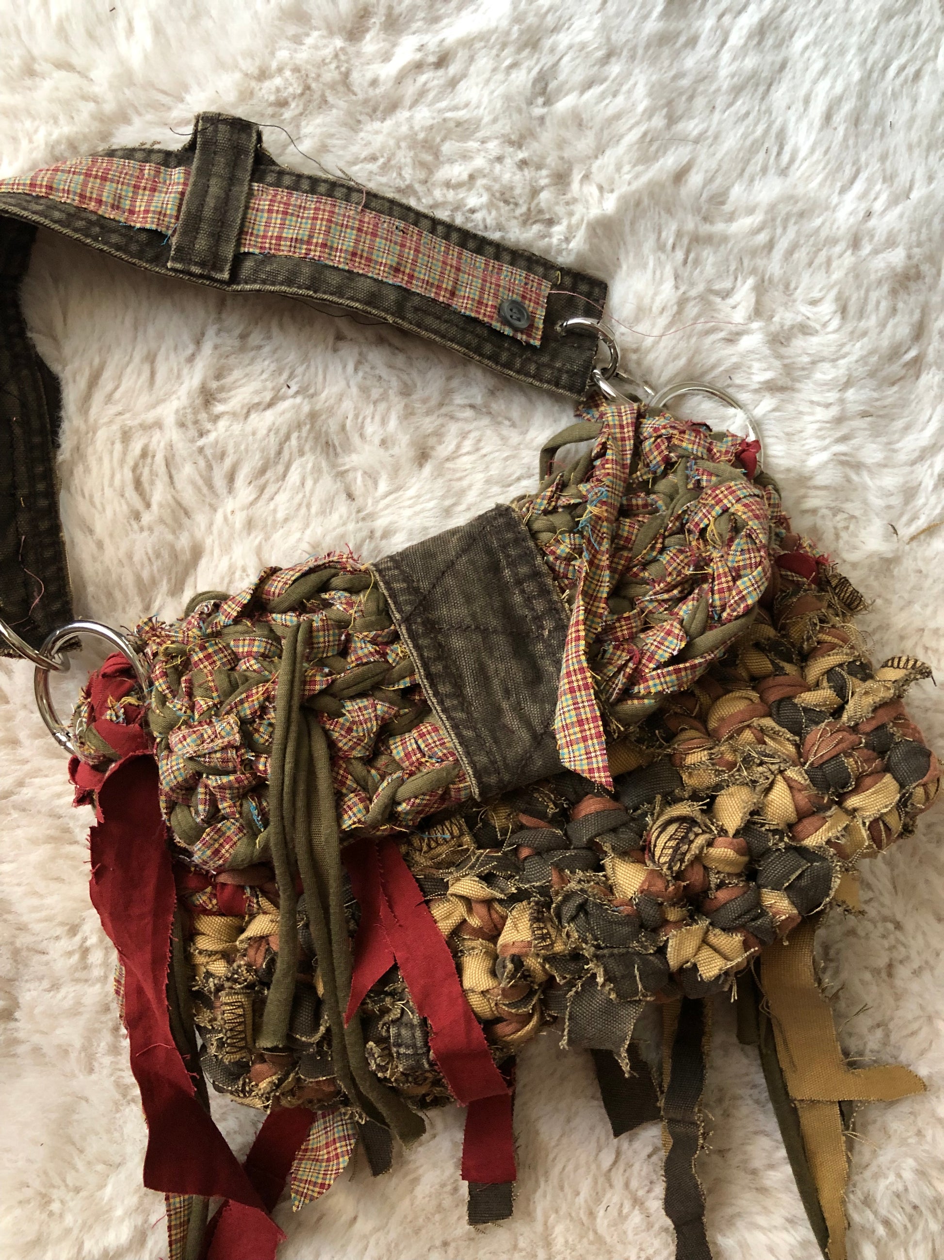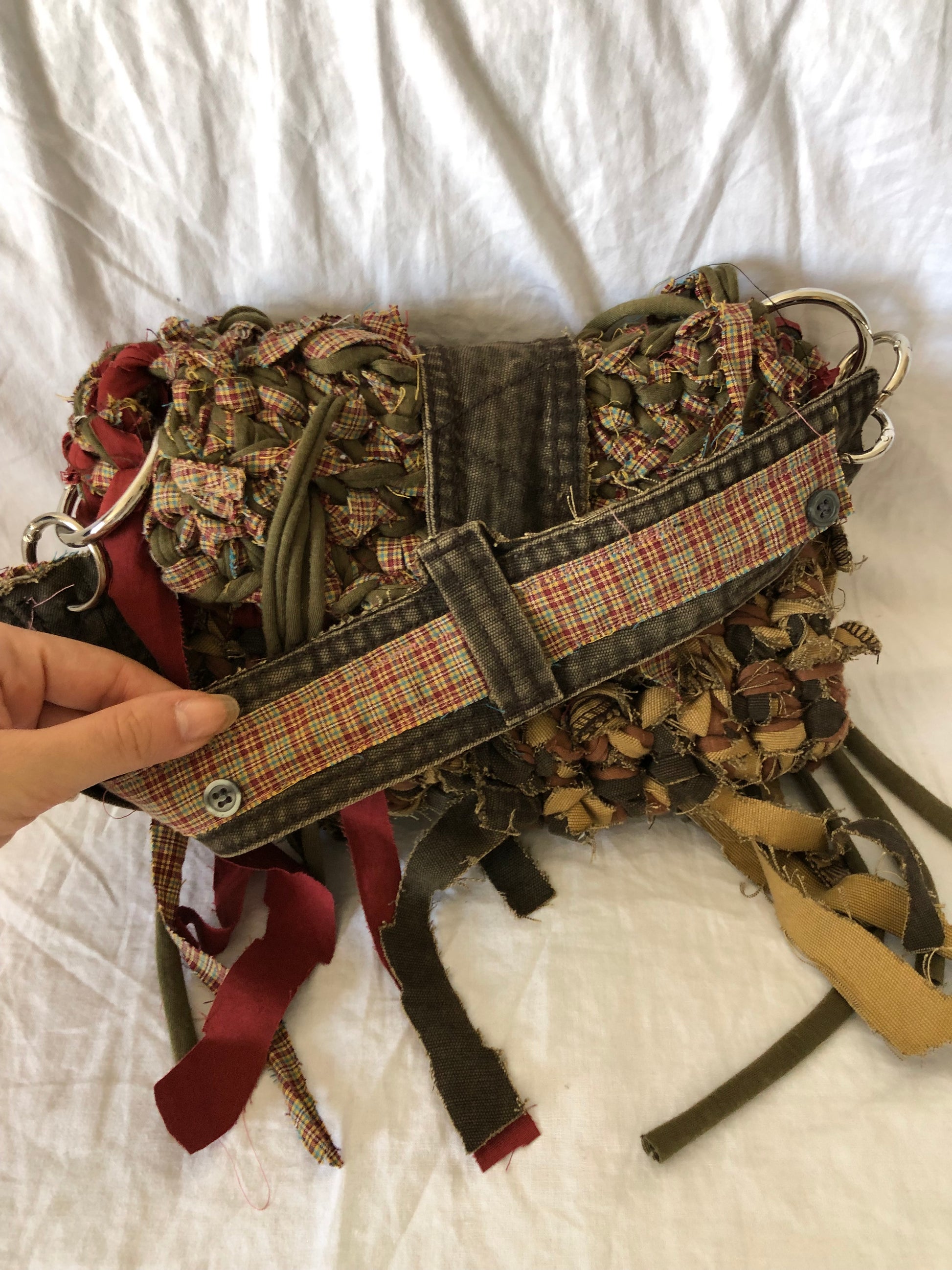 Ogni dettaglio è pensato per esaltare la matericità dei tessuti, con frange irregolari, cuciture visibili e moschettoni metallici. Il patchwork di tessuti intrecciati a mano dona alla borsa una texture vivace e autentica, simbolo di artigianalità e riuso creativo.