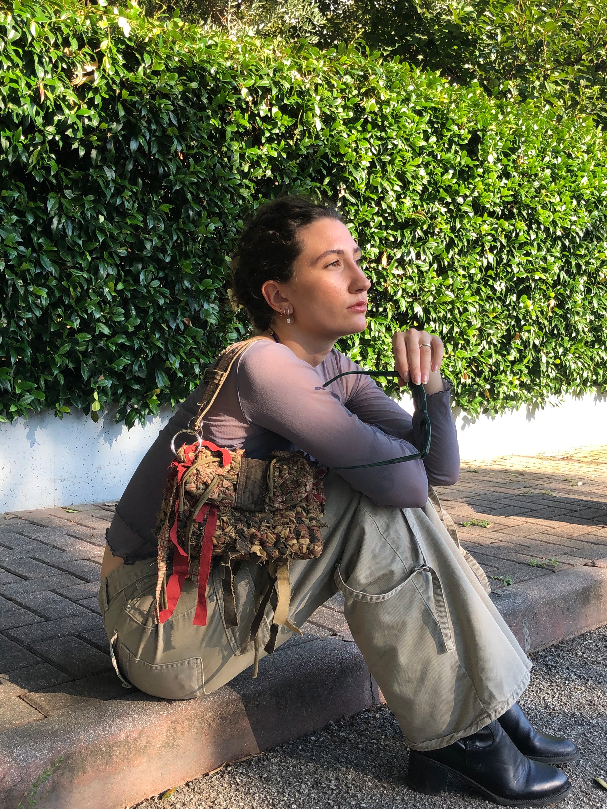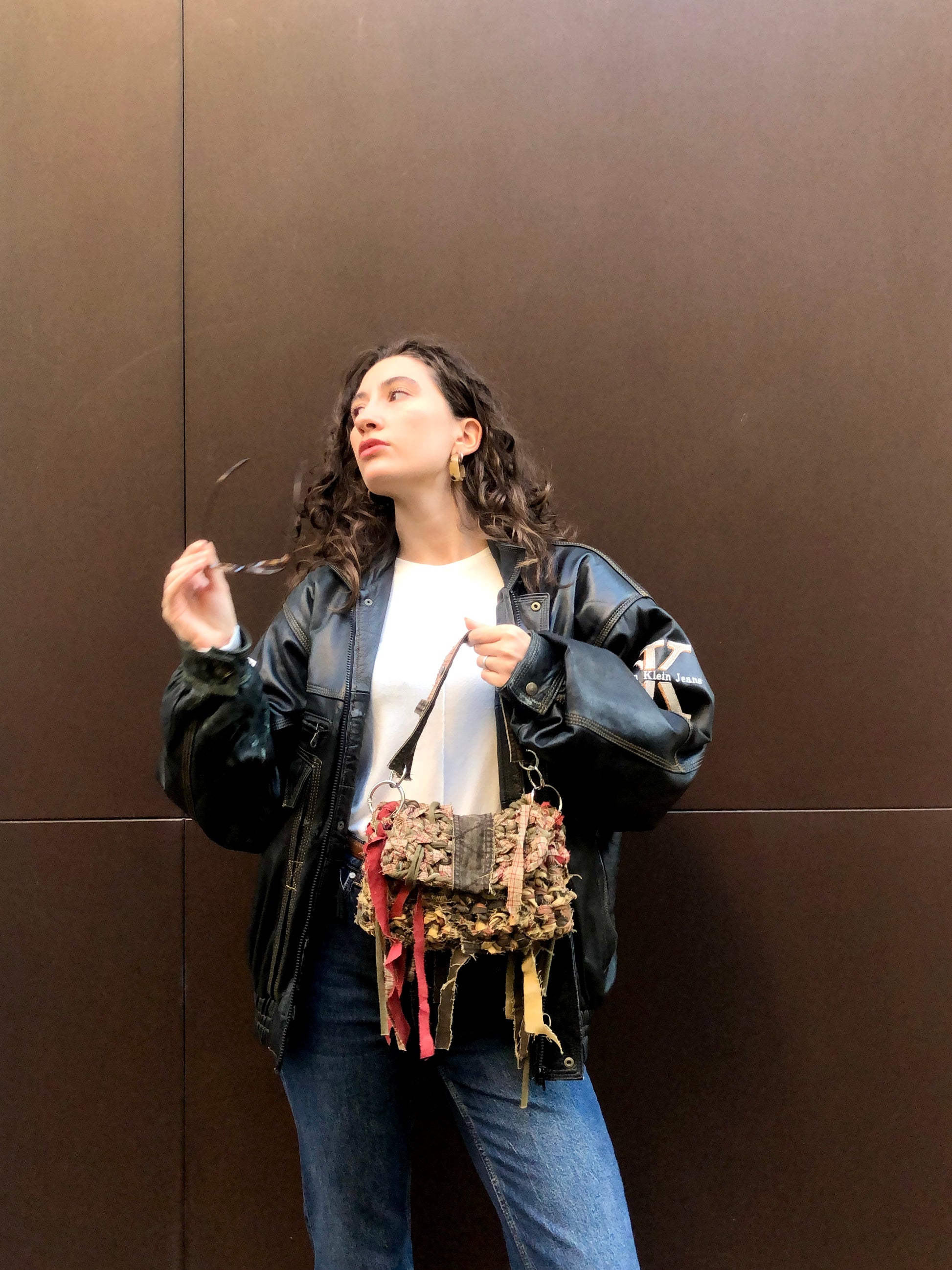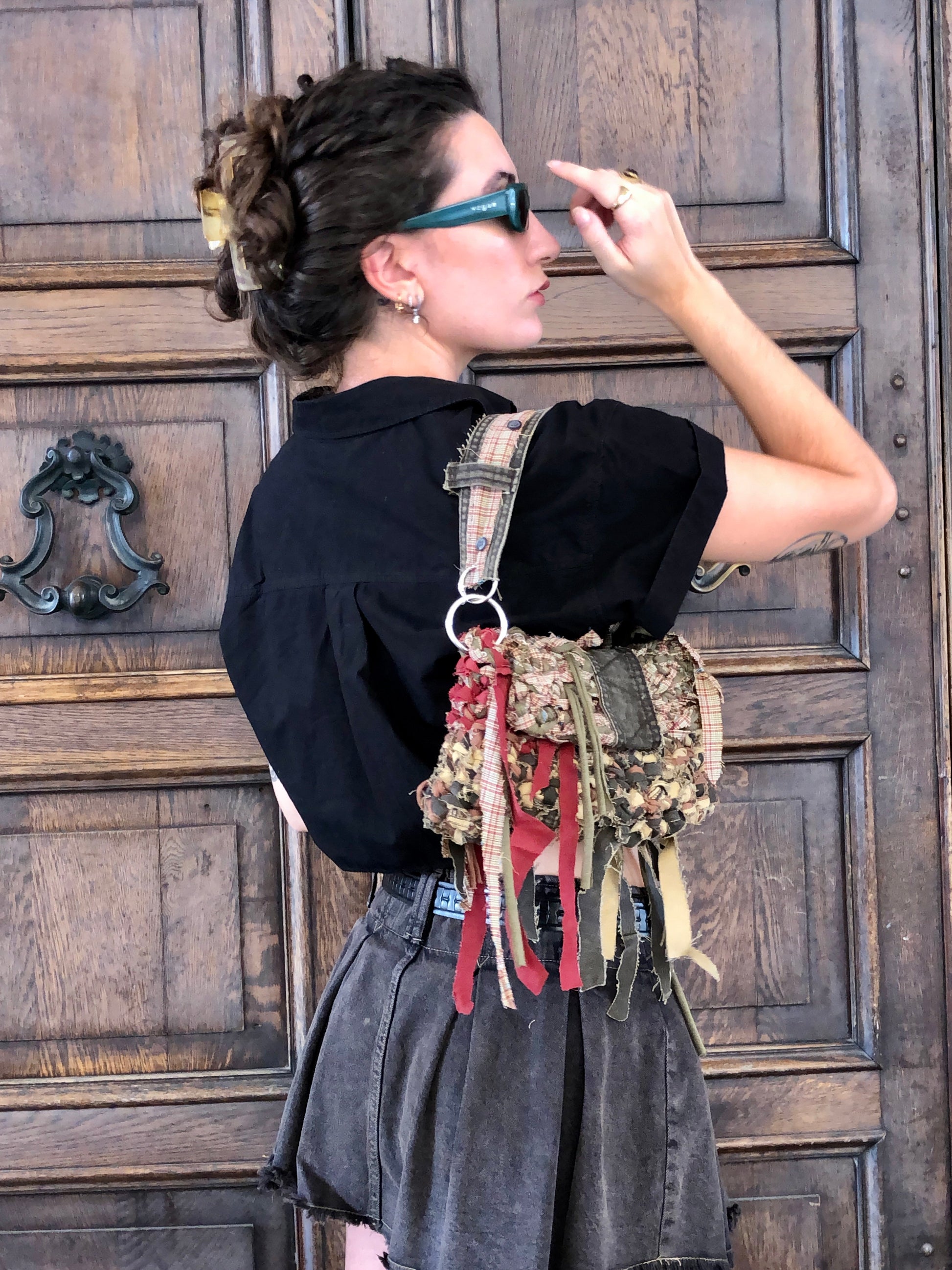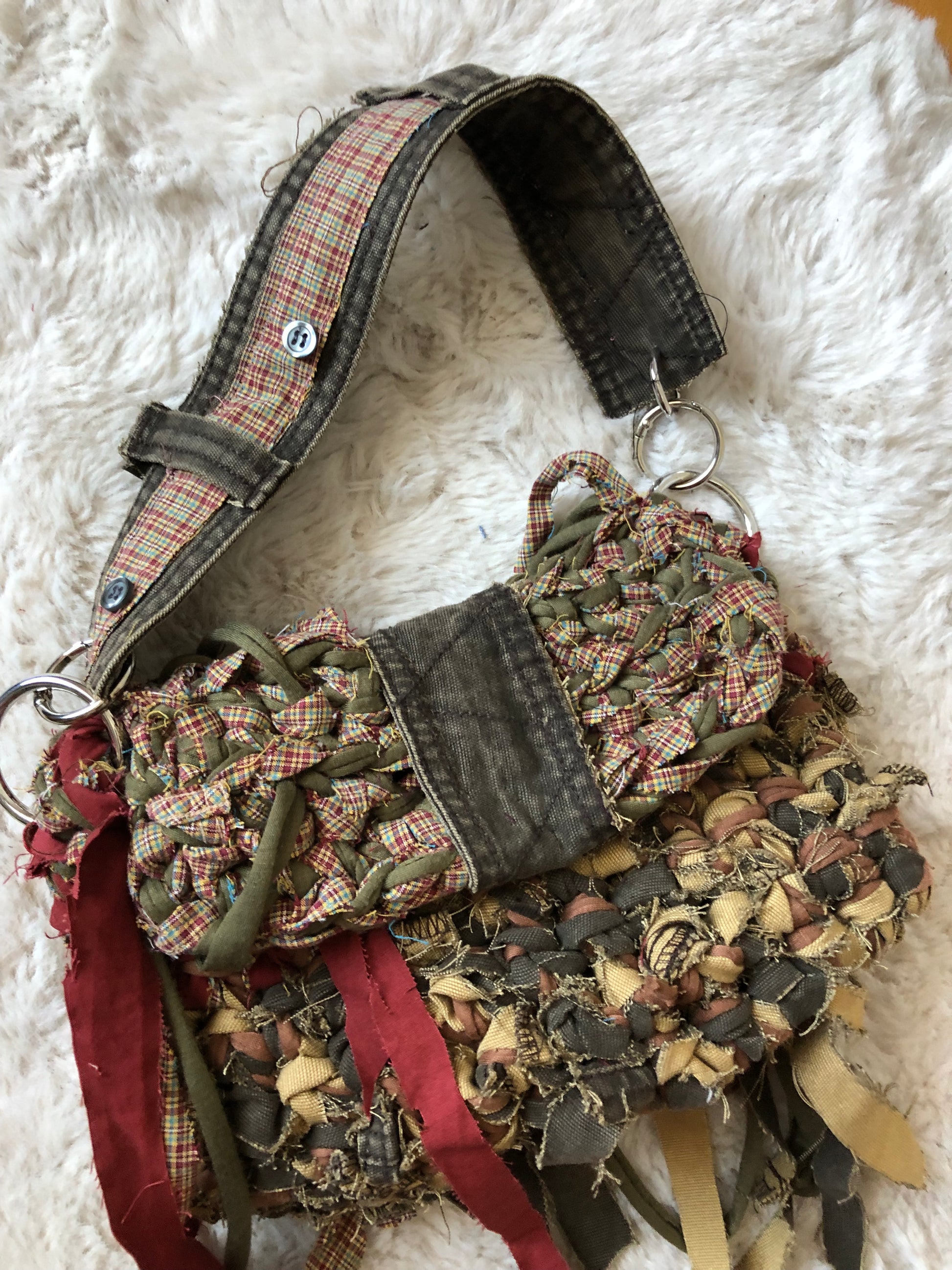 Ogni dettaglio è pensato per esaltare la matericità dei tessuti, con frange irregolari, cuciture visibili e moschettoni metallici. Il patchwork di tessuti intrecciati a mano dona alla borsa una texture vivace e autentica, simbolo di artigianalità e riuso creativo.
