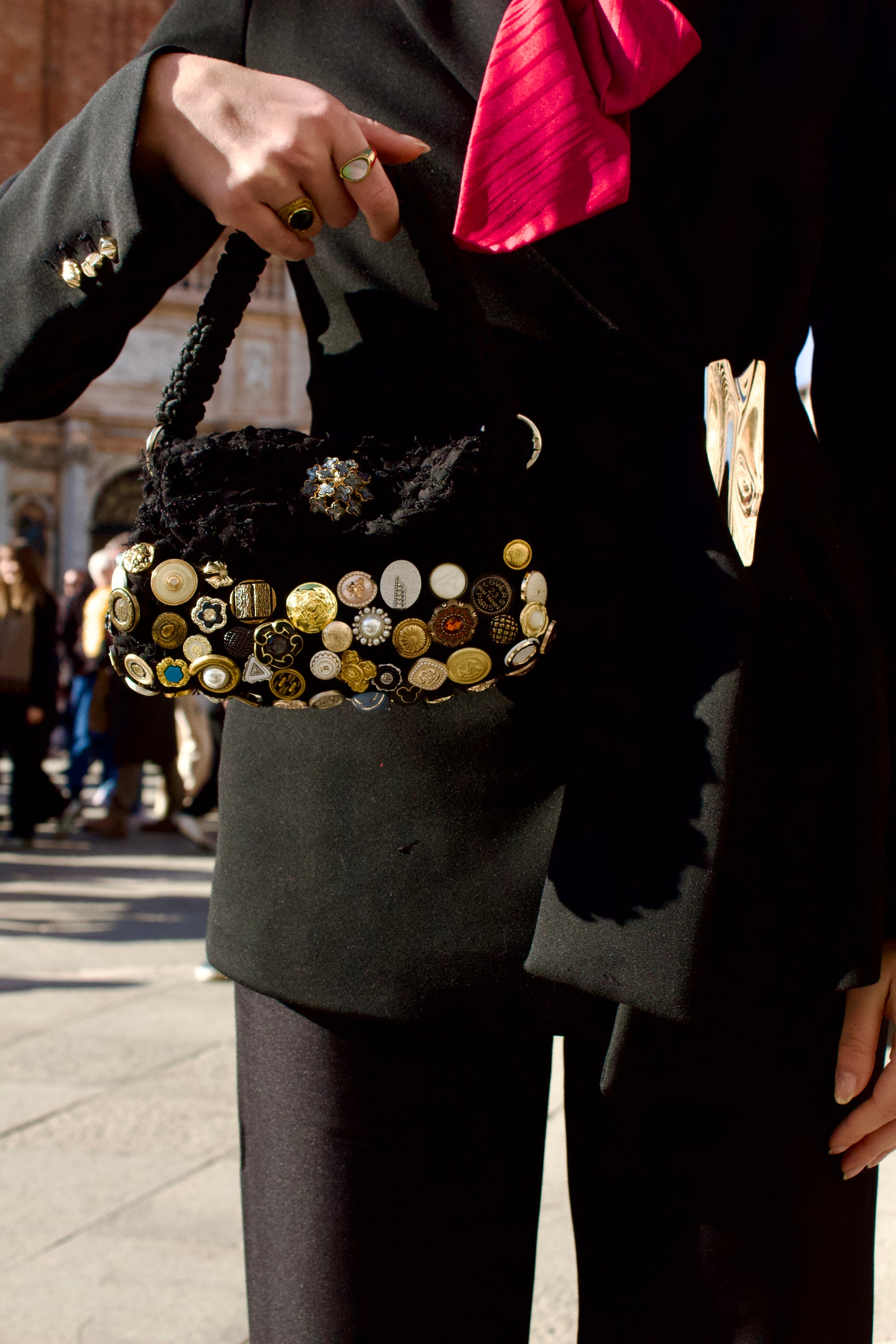 Ogni dettaglio è lavorato con cura, dal taglio del jeans, all'uncinetto, dalla cucitura dei bottoni a mano, alla cucitura della fodera interna. L'estetica dei bottoni selezionati ricorda la ricchezza decorativa del Barocco: dettagli preziosi, l'uso del colore oro, sfarzo, teatralità e ricerca di stupore.