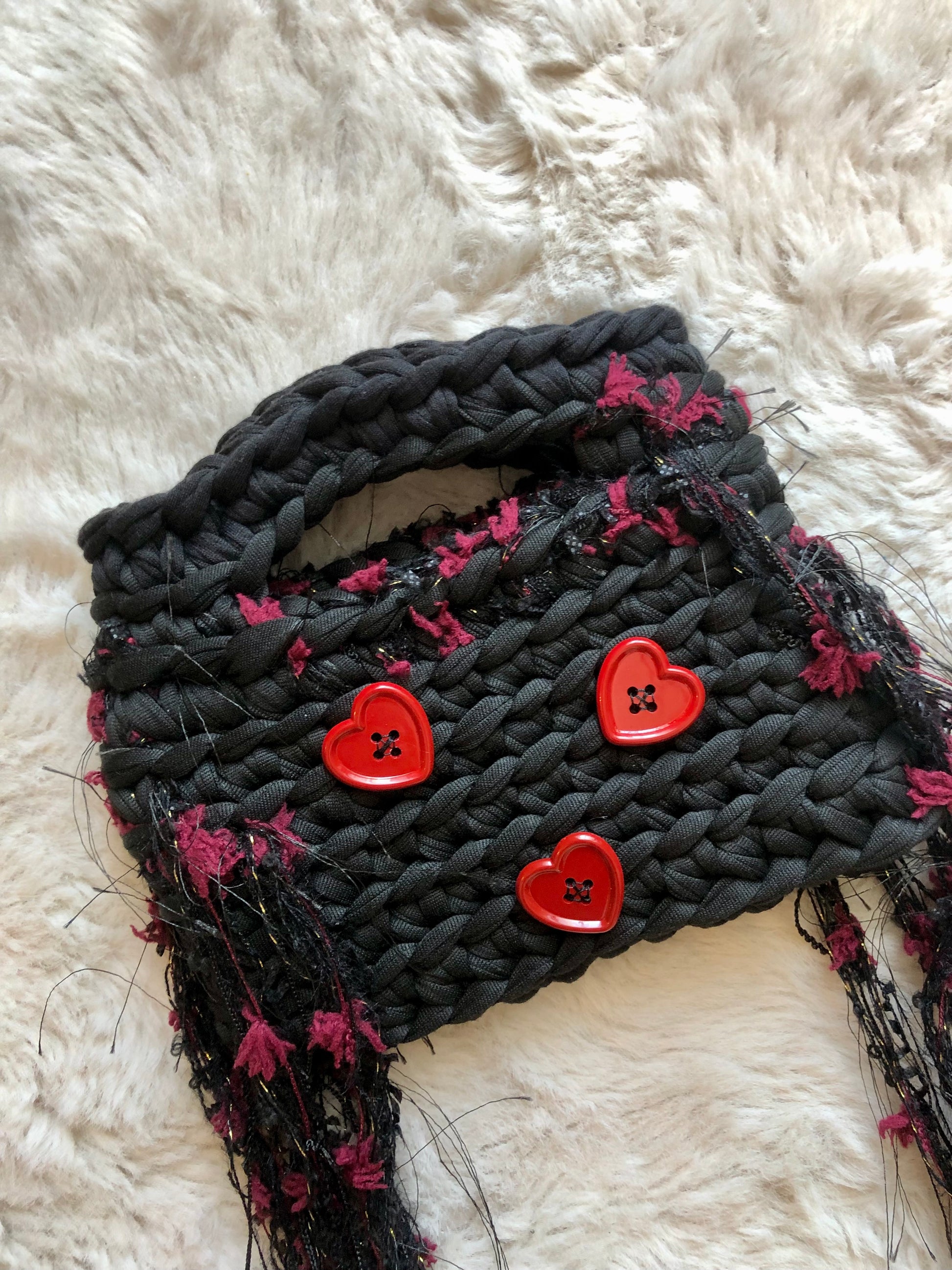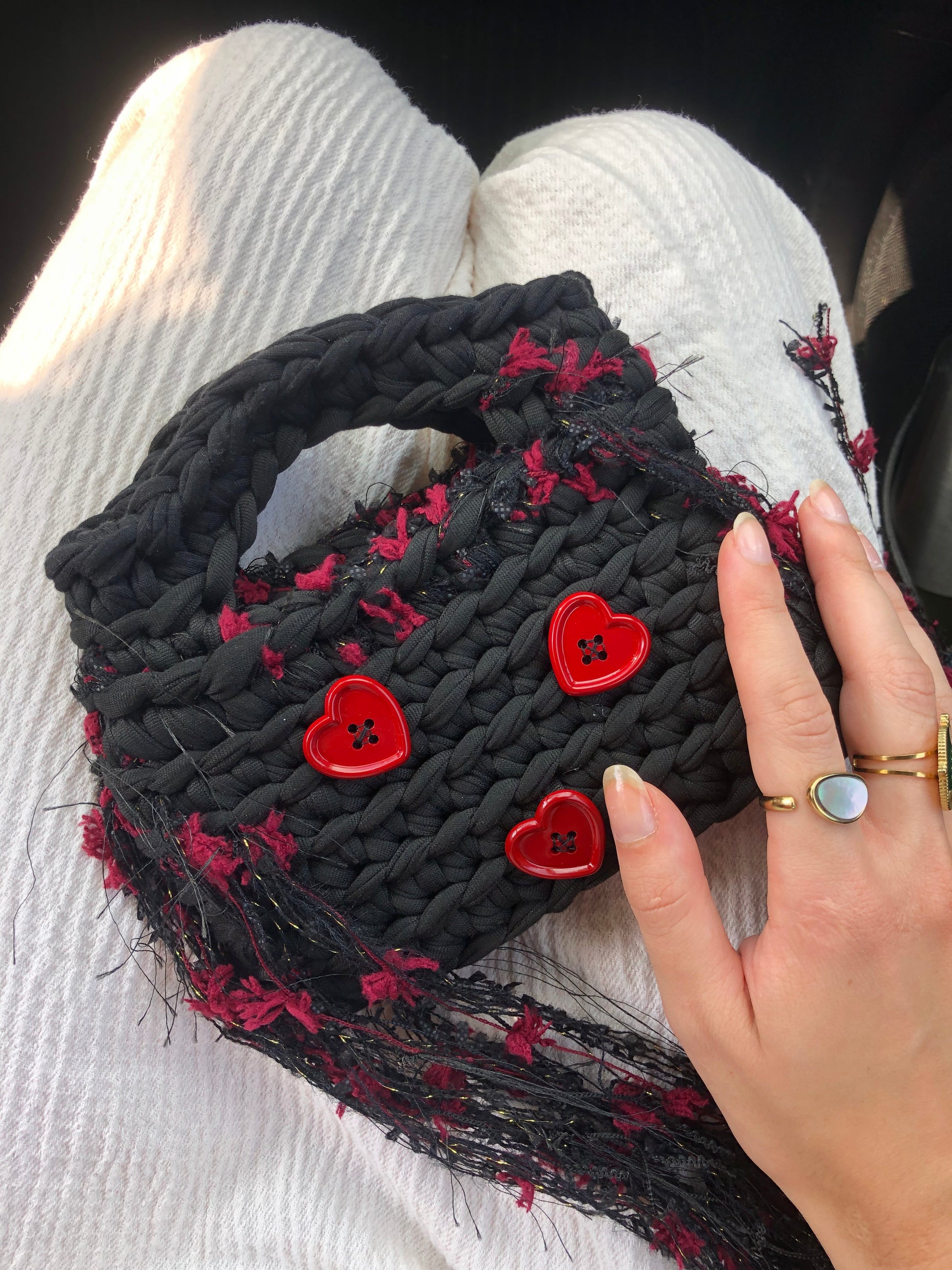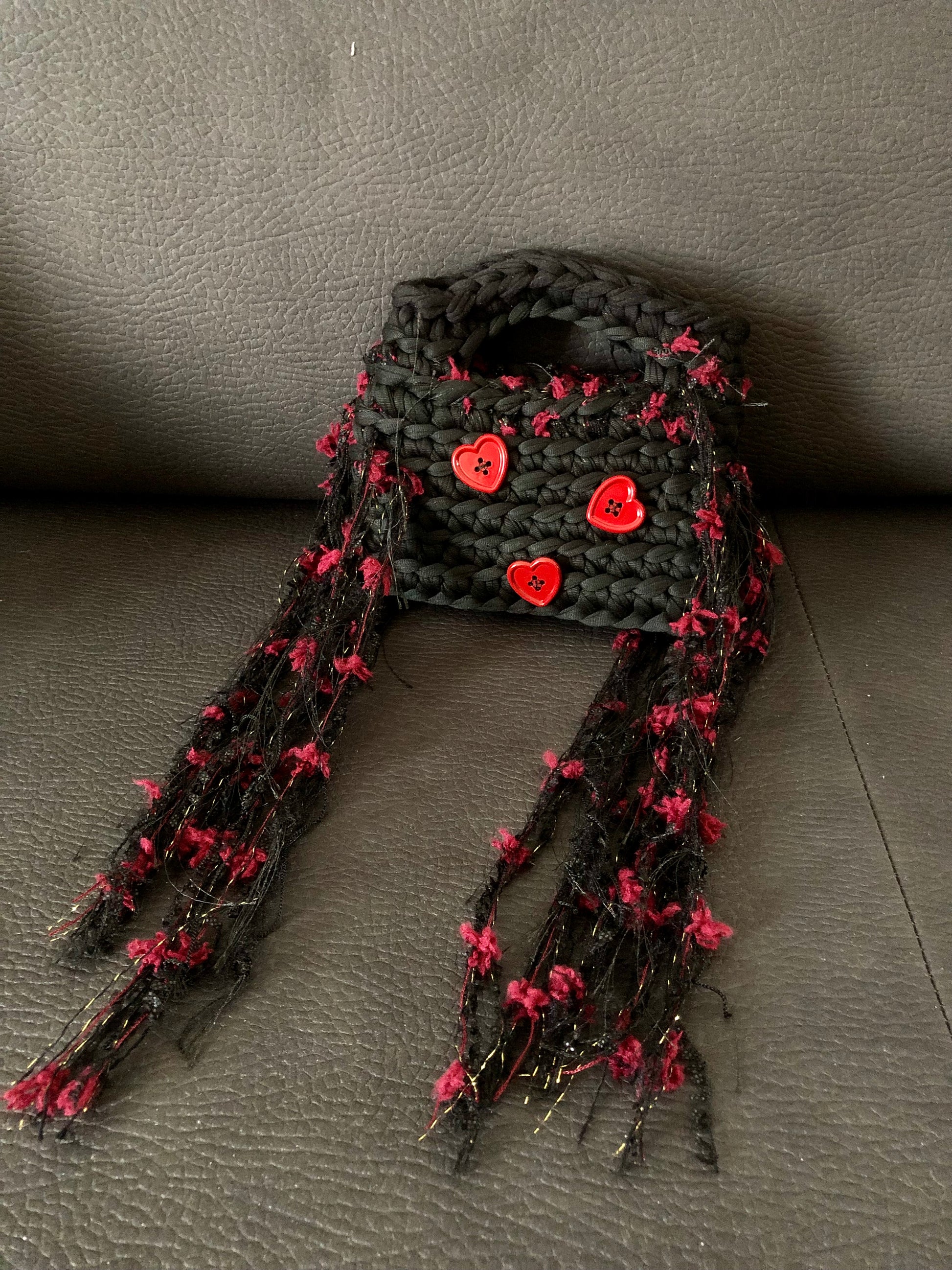 La Romantica è pensata per chi ama l'eleganza con un tocco di originalità. Realizzata all'uncinetto, è impreziosita da lunghi inserti in filato decorativo nero e rosso, con tocchi dorati che danno luce e movimento. Tre bottoni rossi a forma di cuore la rendono giocosa, dolce e assolutamente unica.