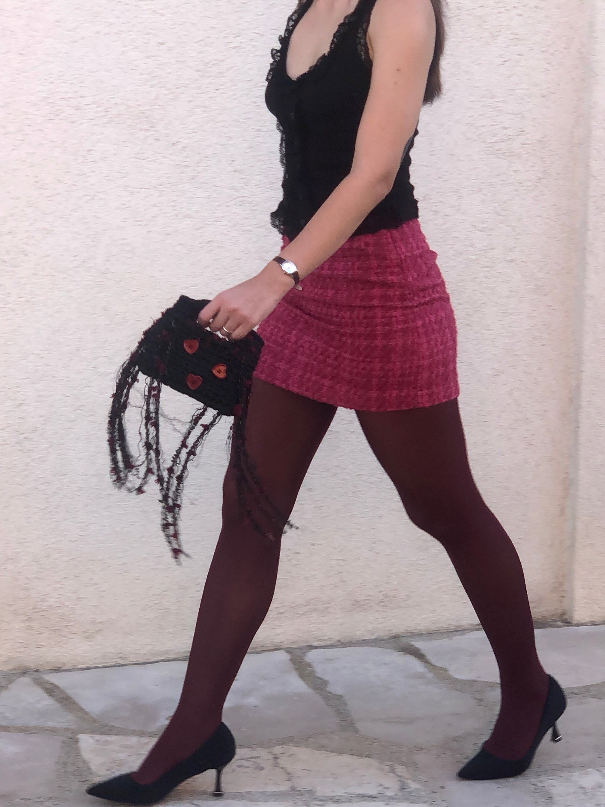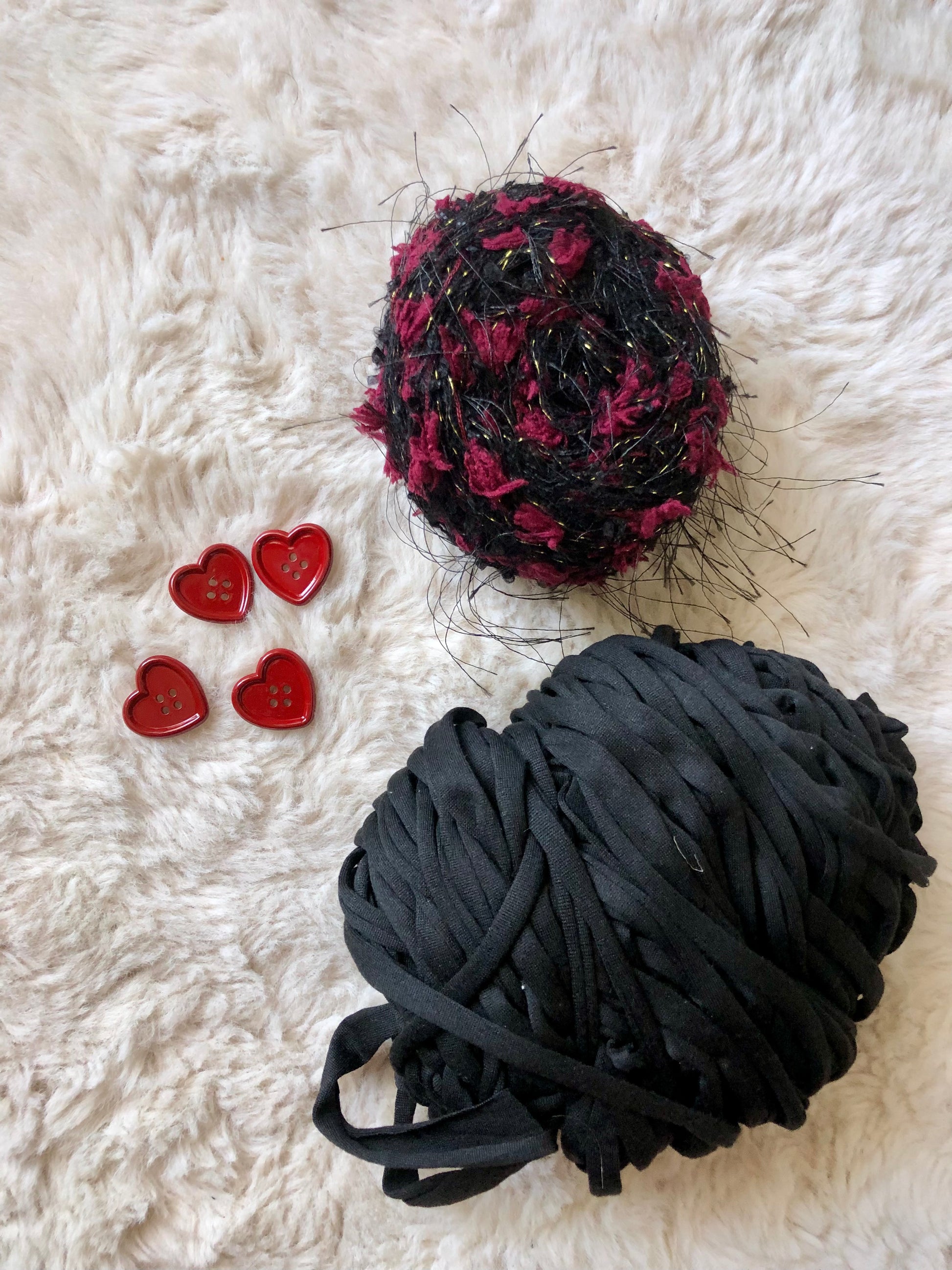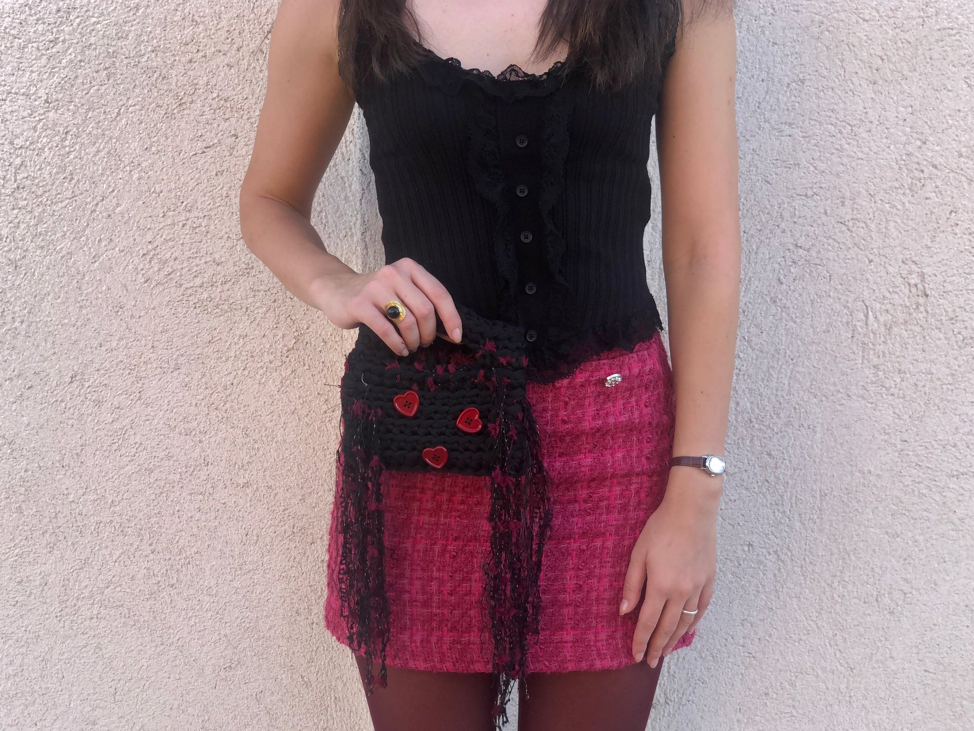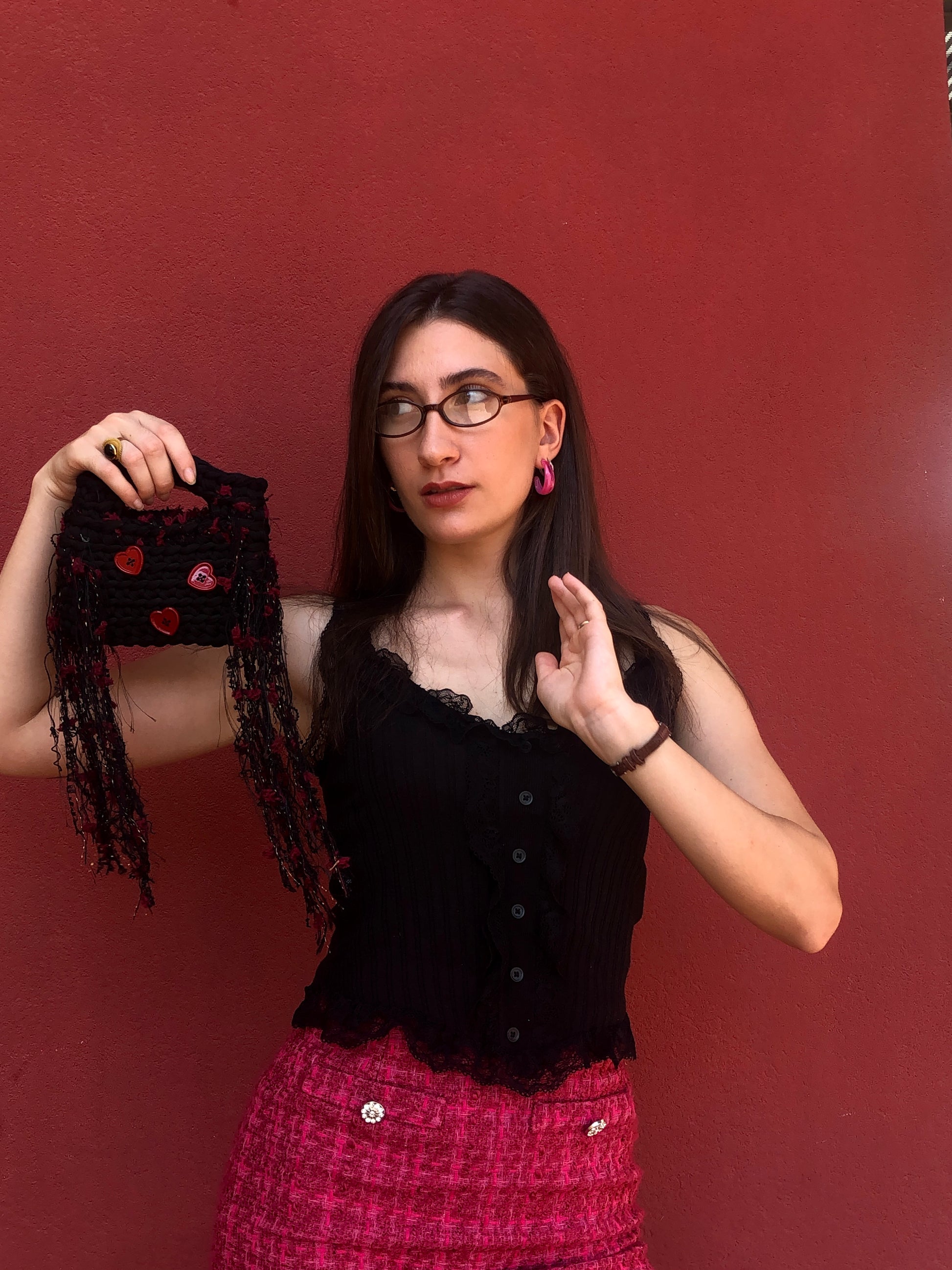 La Romantica è pensata per chi ama l'eleganza con un tocco di originalità. Realizzata all'uncinetto, è impreziosita da lunghi inserti in filato decorativo nero e rosso, con tocchi dorati che danno luce e movimento. Tre bottoni rossi a forma di cuore la rendono giocosa, dolce e assolutamente unica.