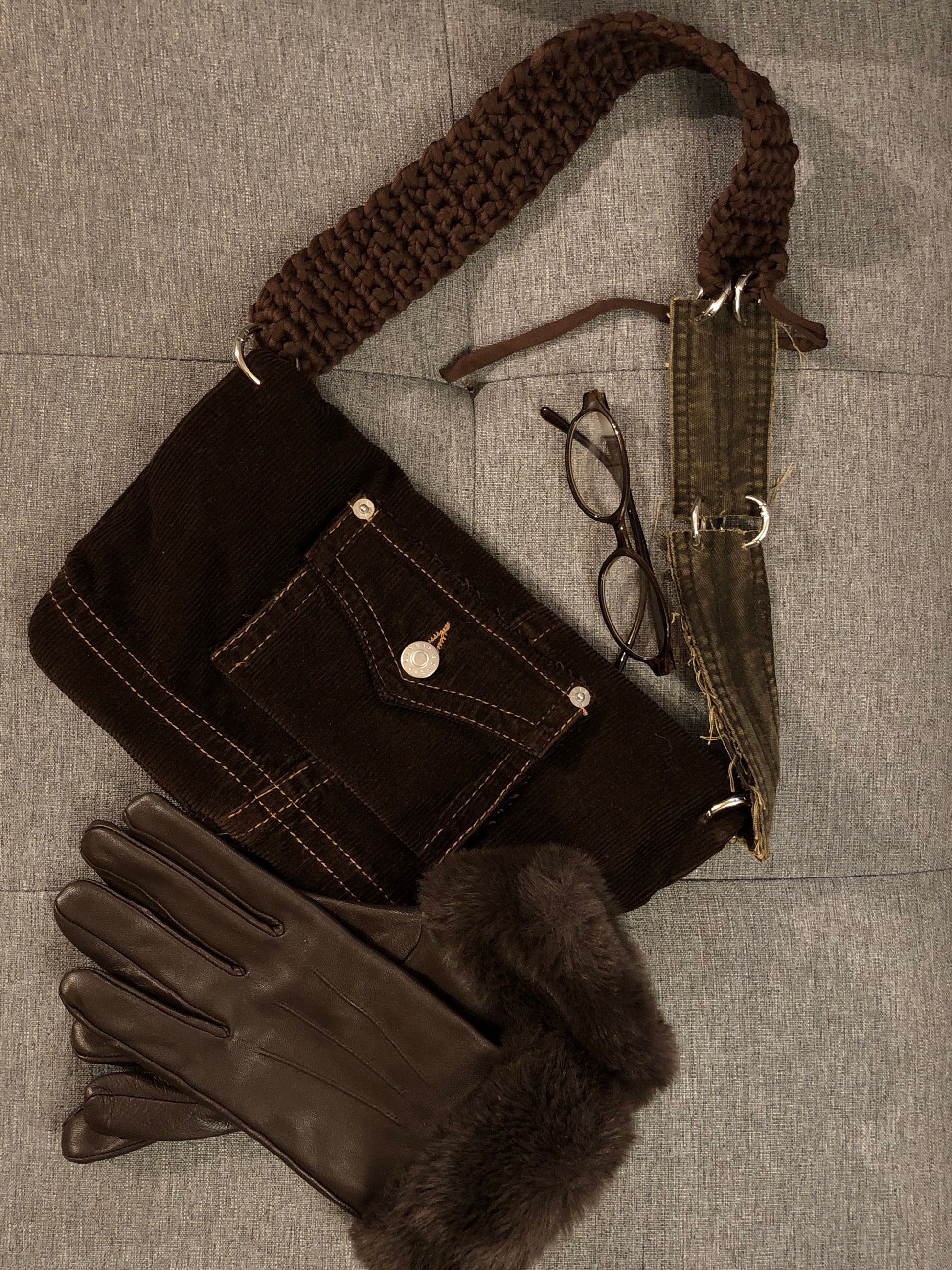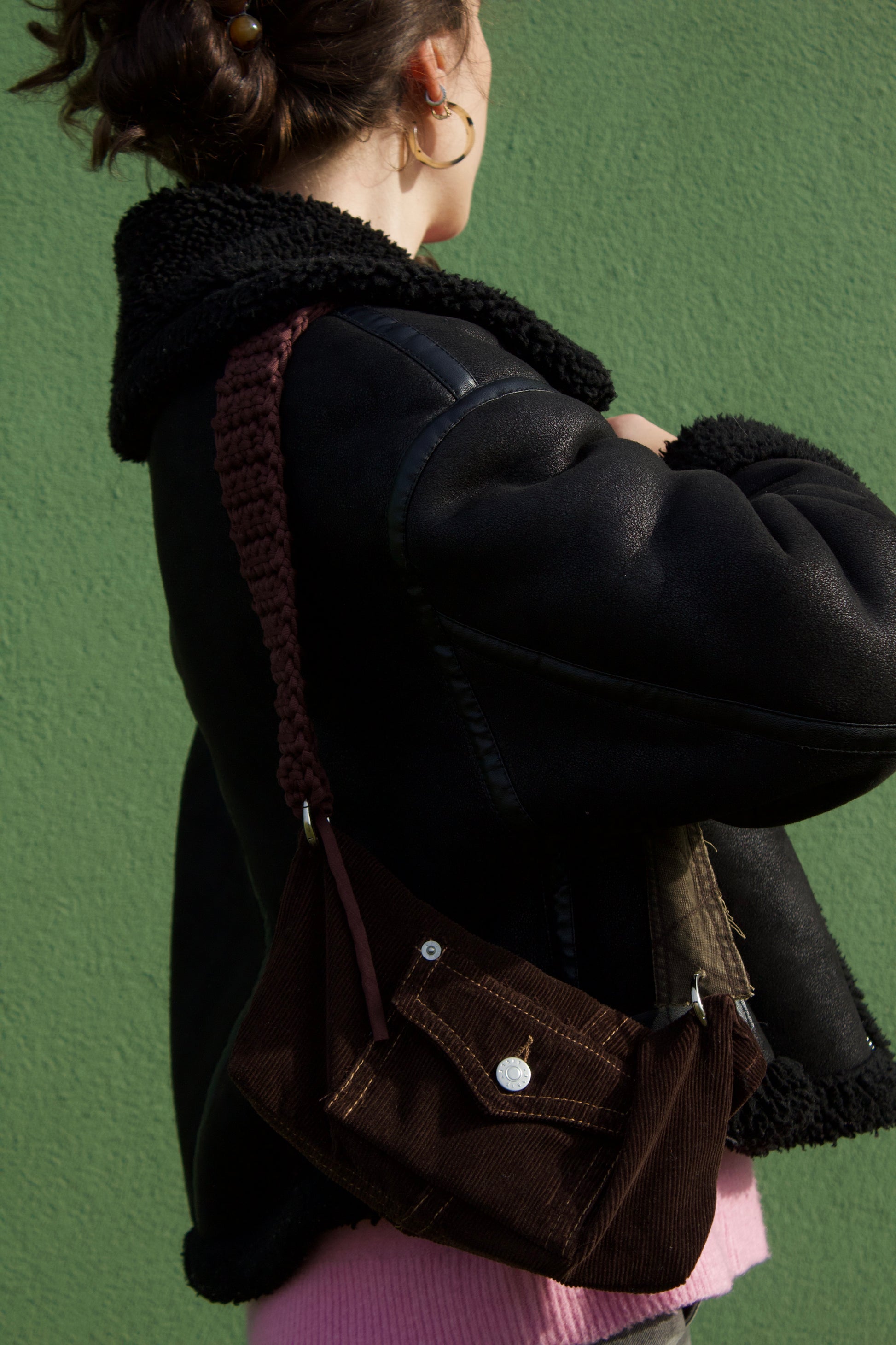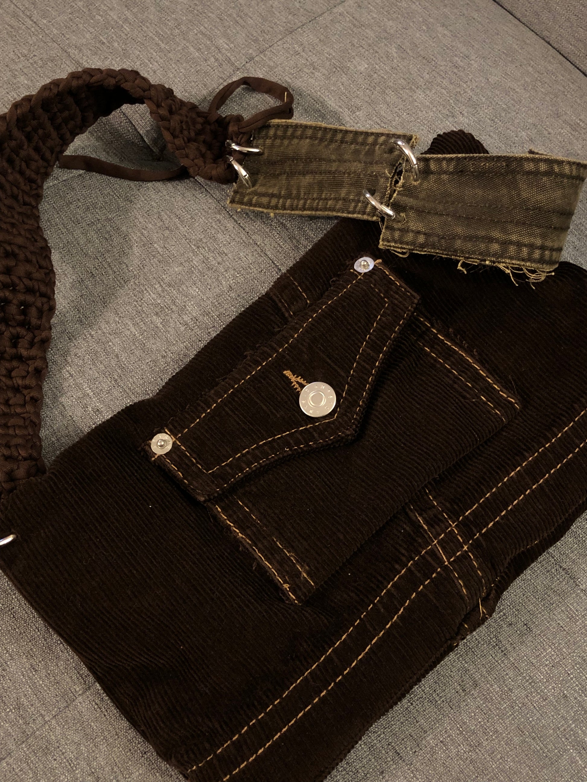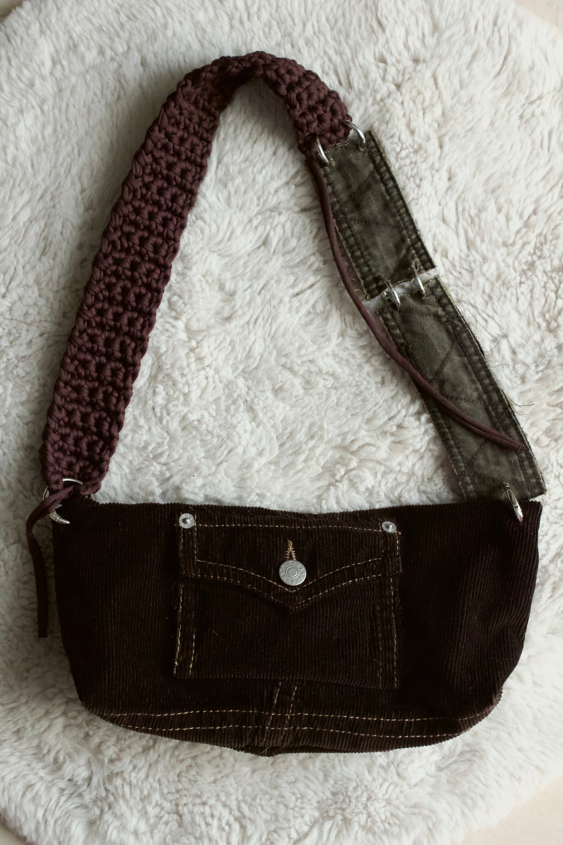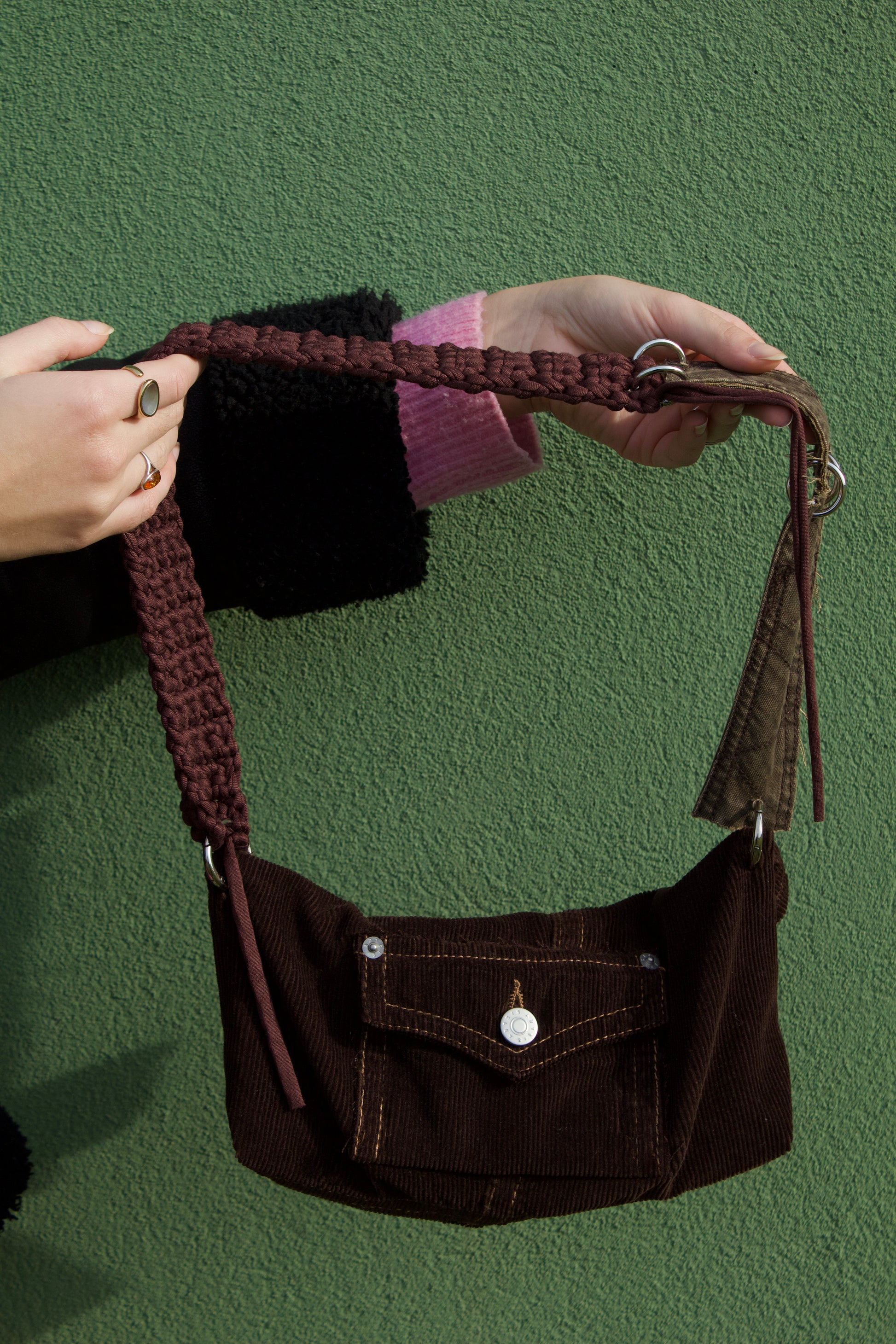 Mocha è una la borsa artigianale realizzata in corduroy (velluto) marrone nata dalla volontà di conservare la materia prima (il jeans riciclato da cui è stata ricavata) nella sua interezza.