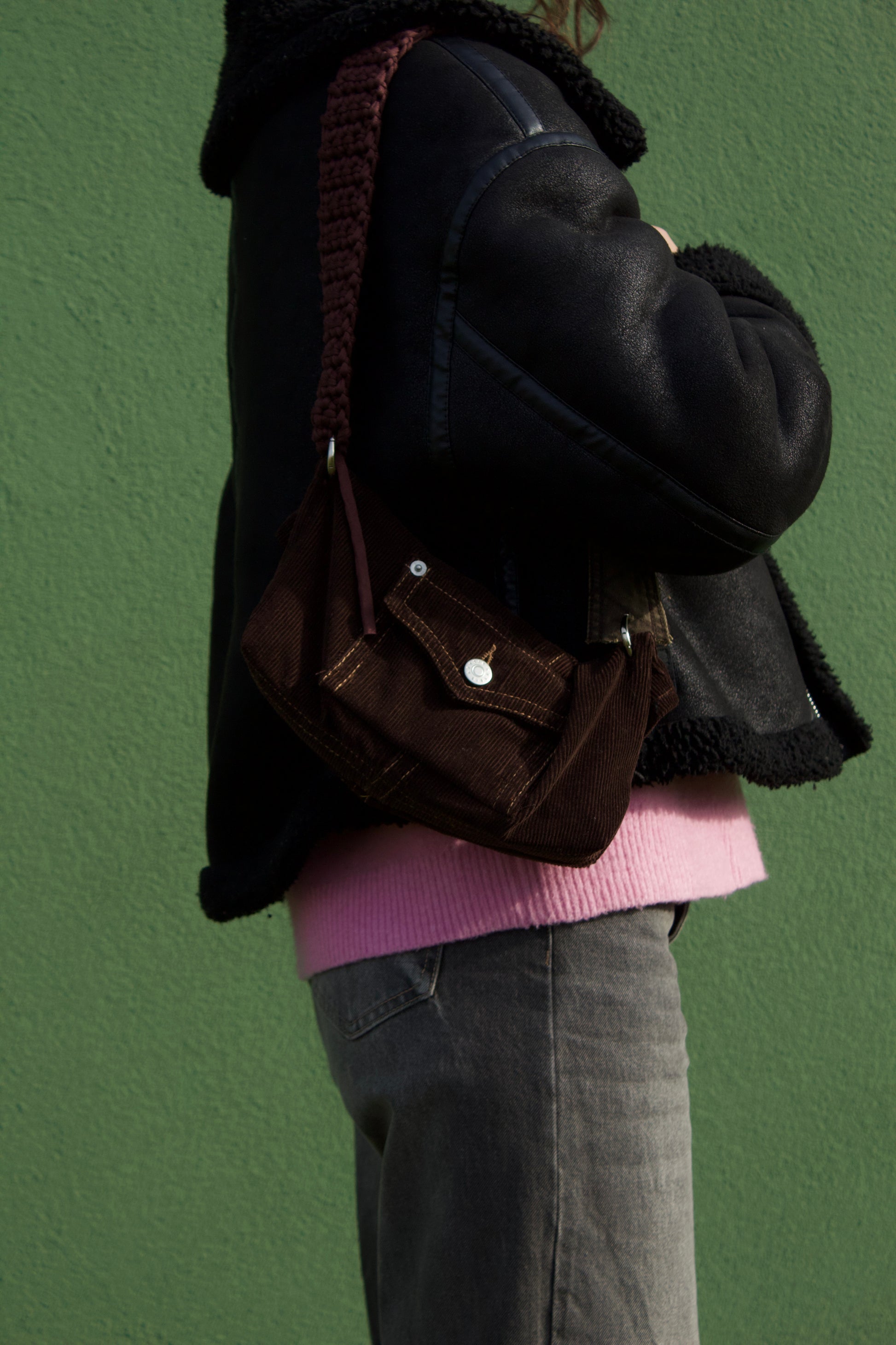 La trama ricca del velluto a coste le conferisce profondità e un tocco vintage, mentre la tracolla garantisce comfort e praticità in ogni occasione.
