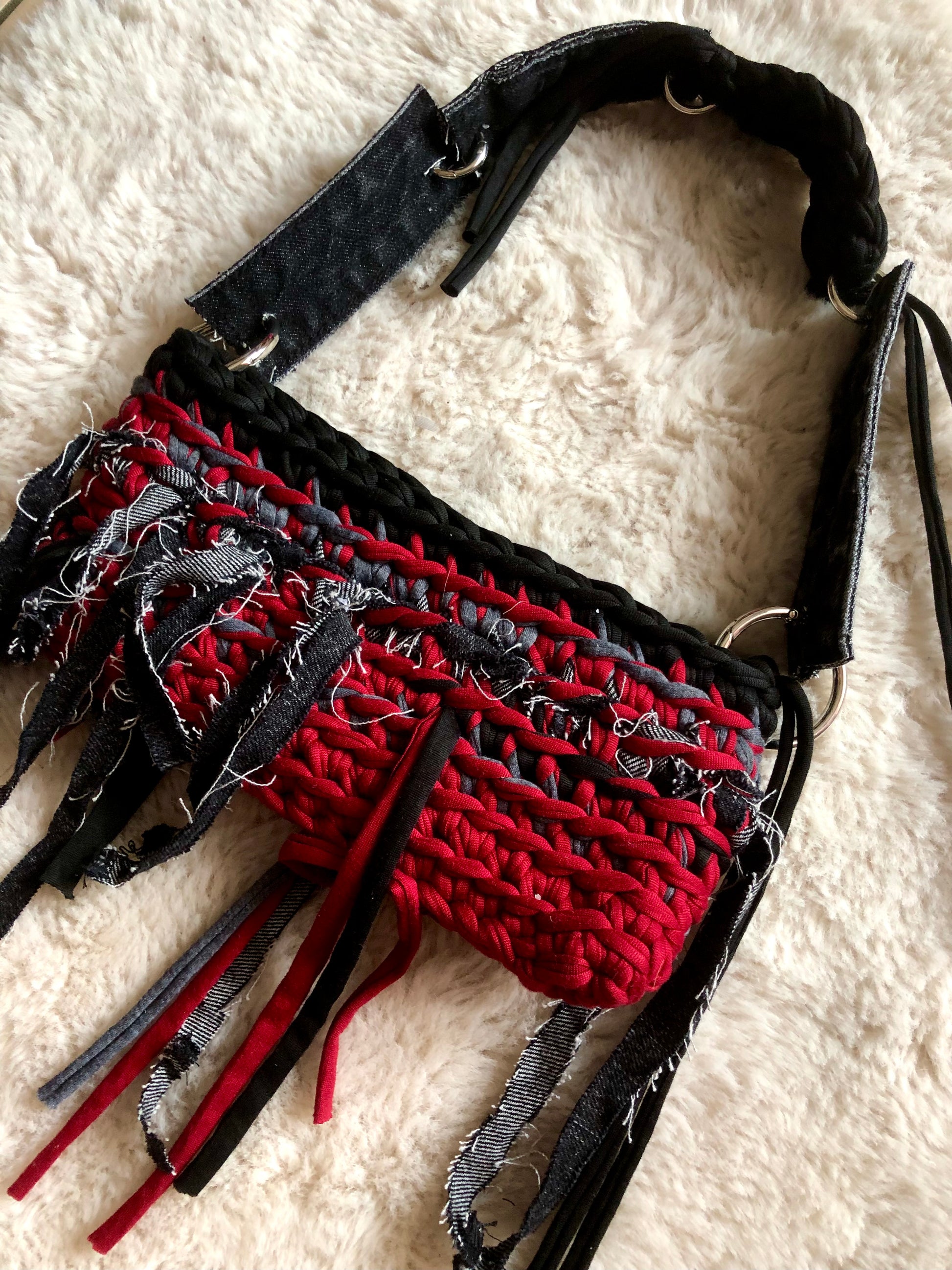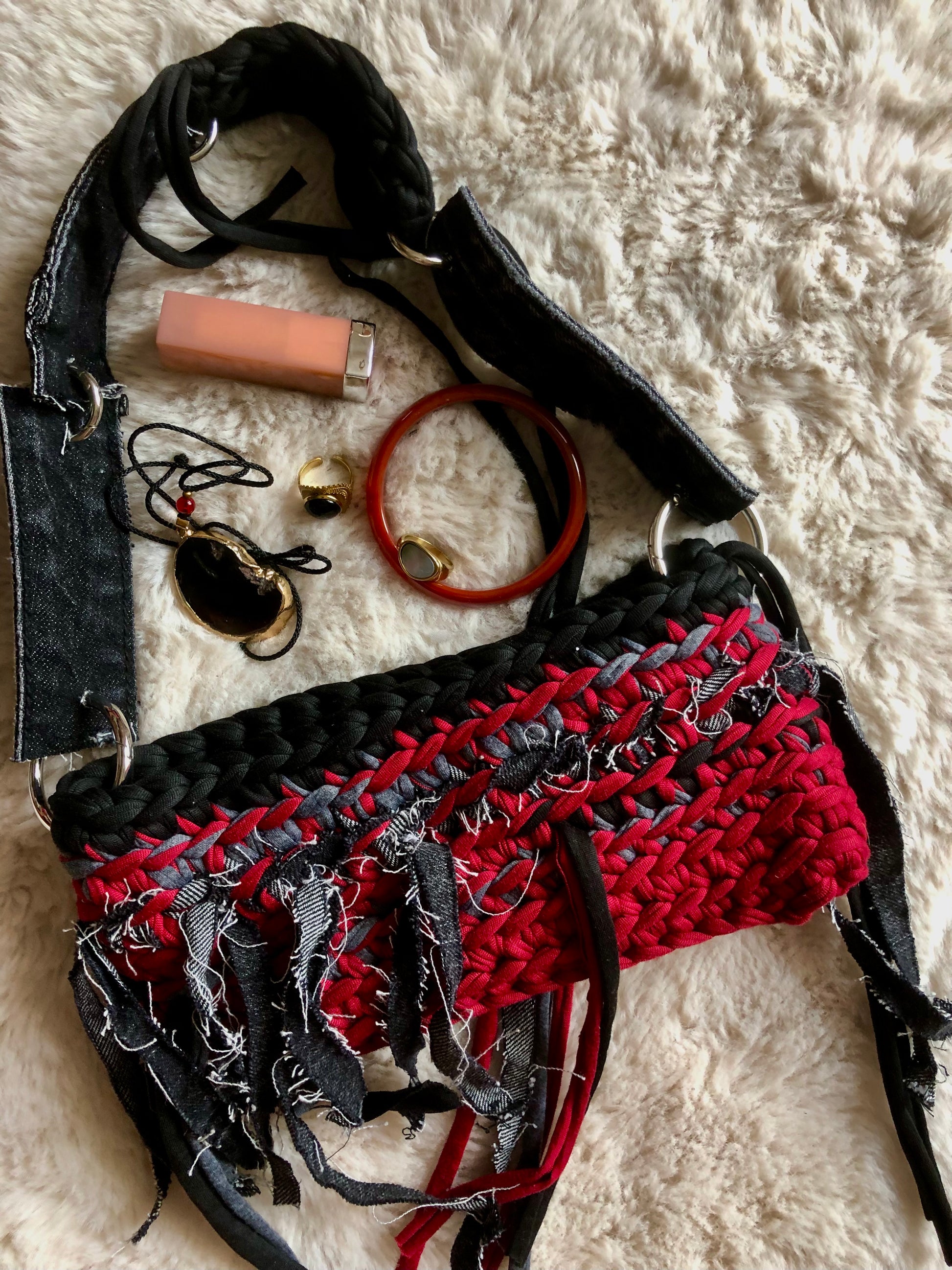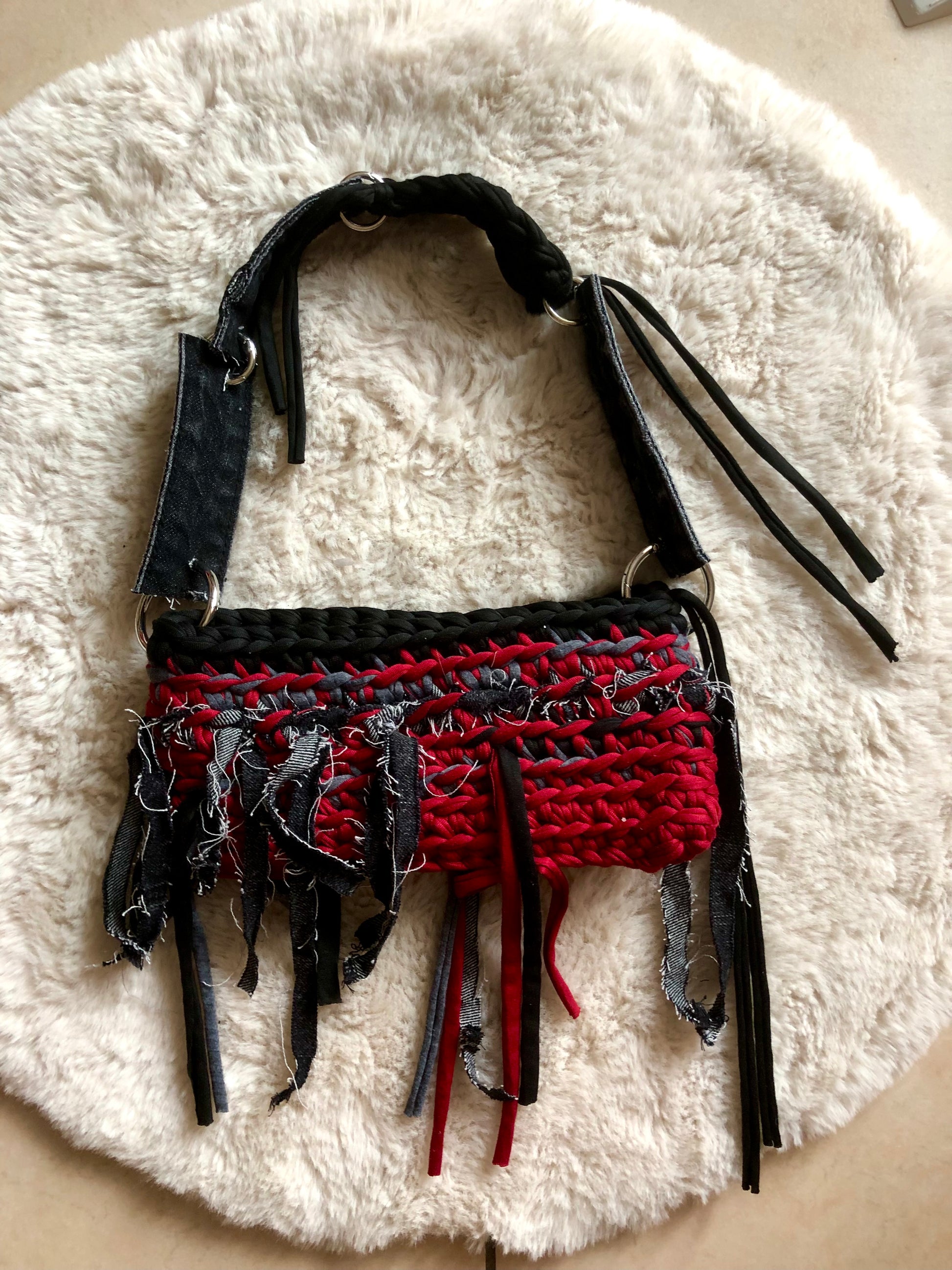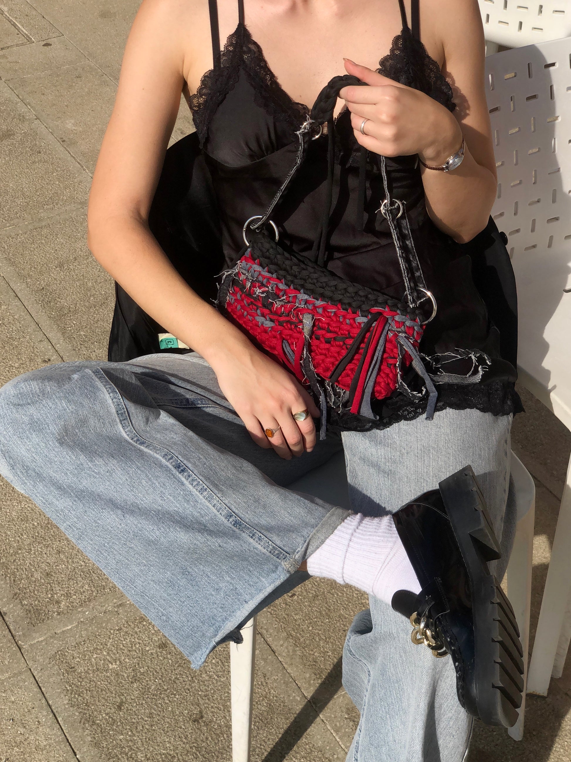 La Queen denim è fatta a mano con cura, per chi ama lo stile urbano, deciso e sostenibile. Il contrasto tra il rosso intenso e il nero, unito alle frange in denim grezzo, dona carattere e unicità ad ogni dettaglio.
