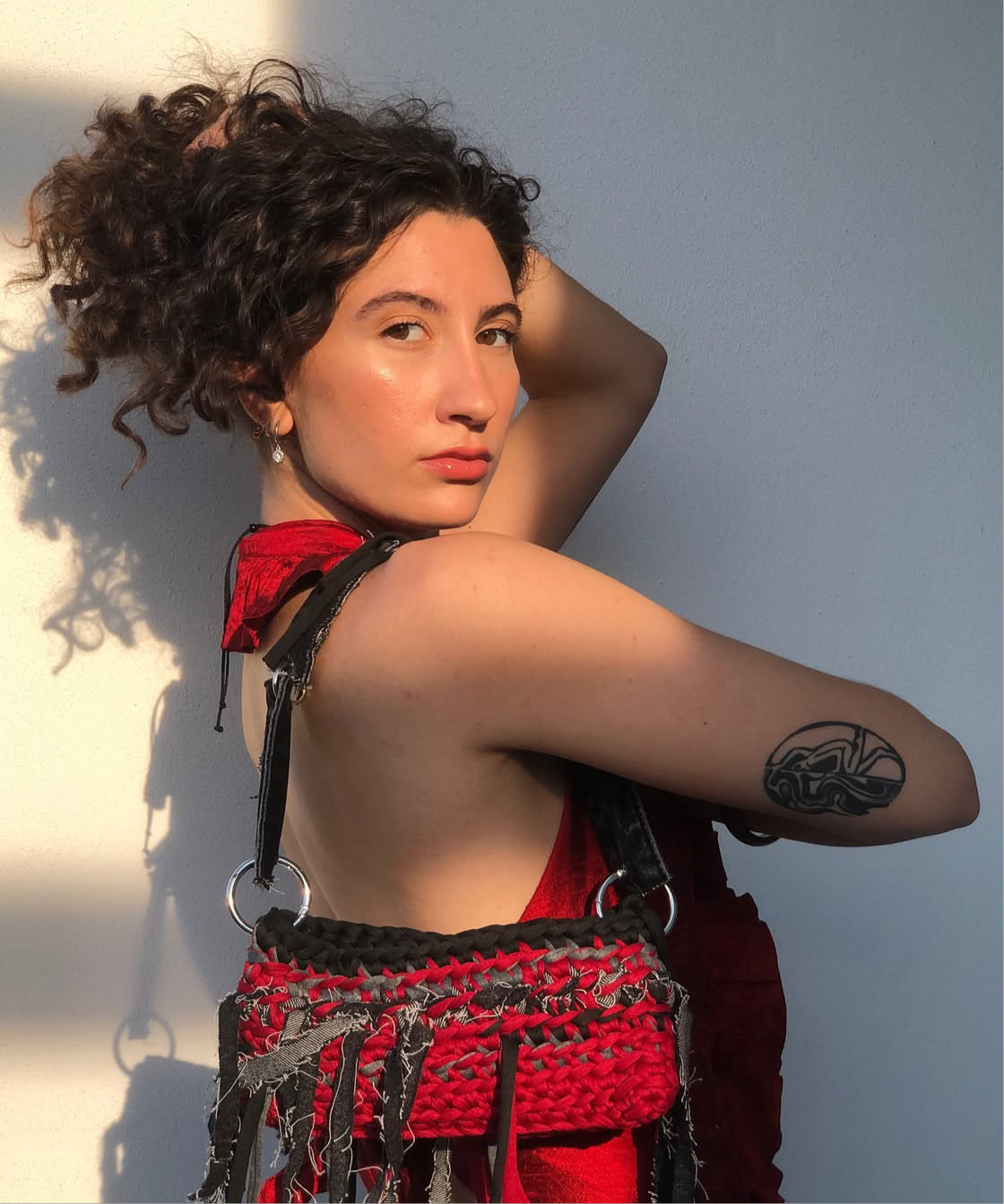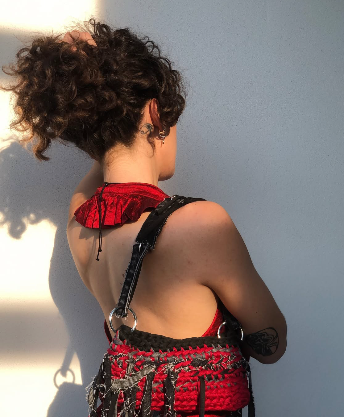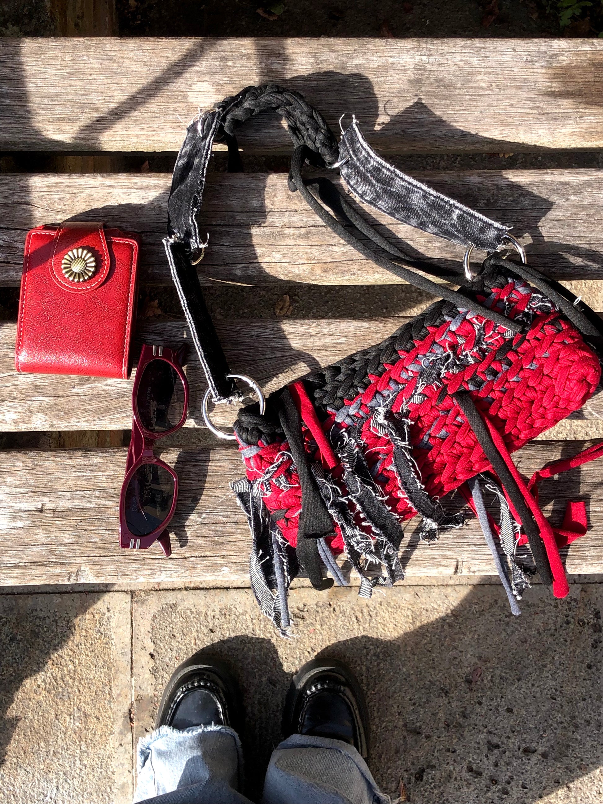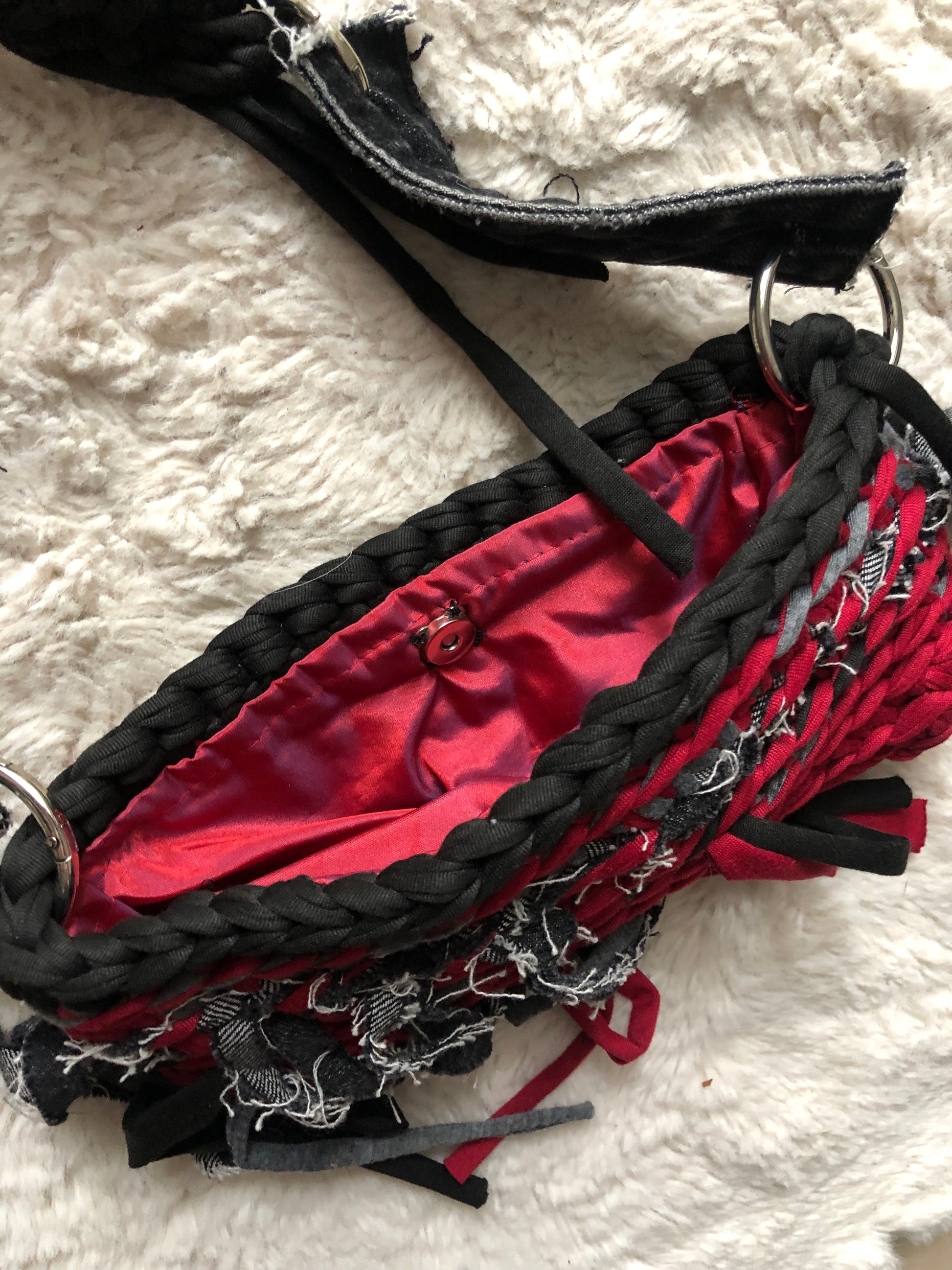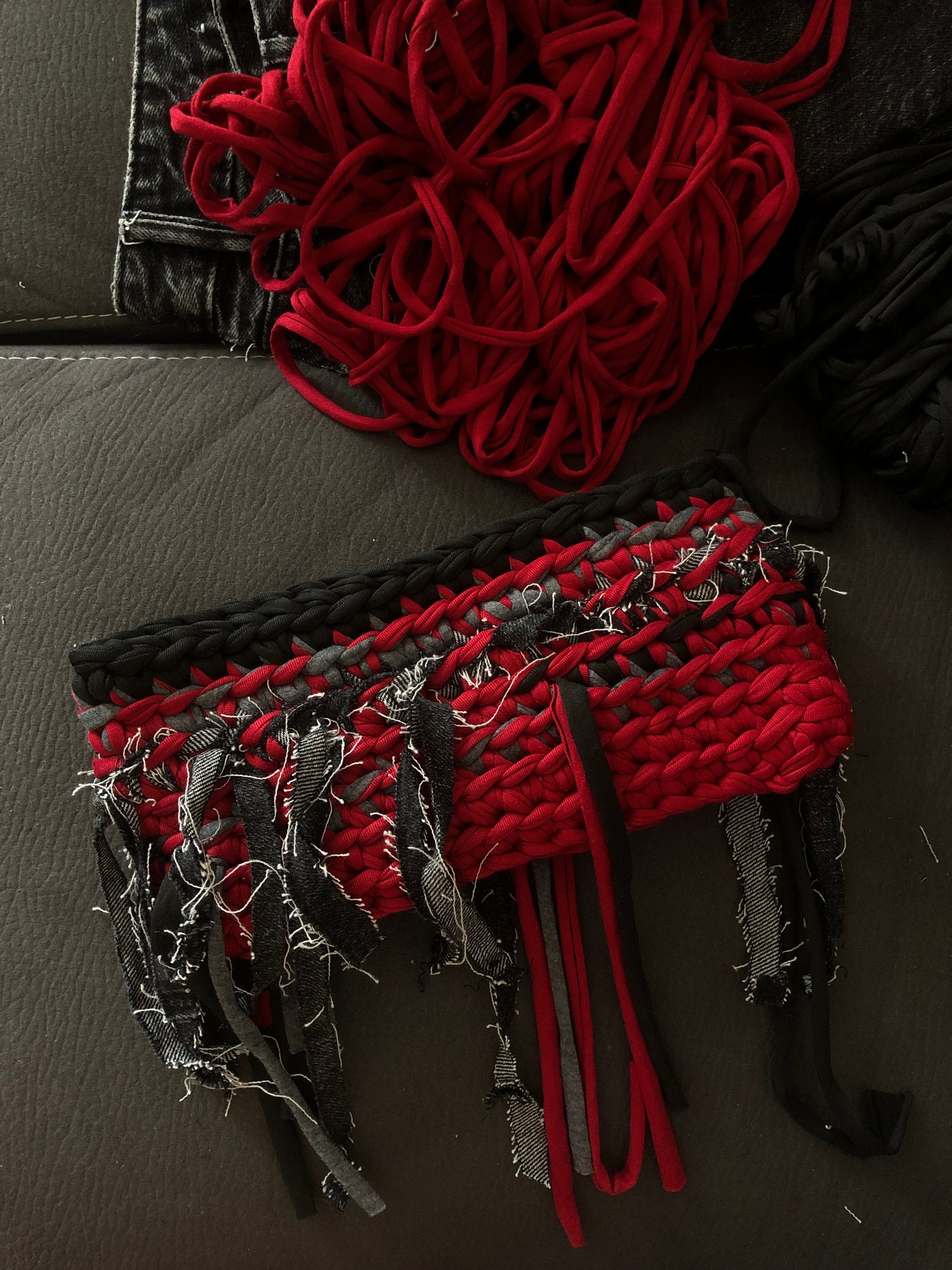 La Queen denim è fatta a mano con cura, per chi ama lo stile urbano, deciso e sostenibile. Il contrasto tra il rosso intenso e il nero, unito alle frange in denim grezzo, dona carattere e unicità ad ogni dettaglio.